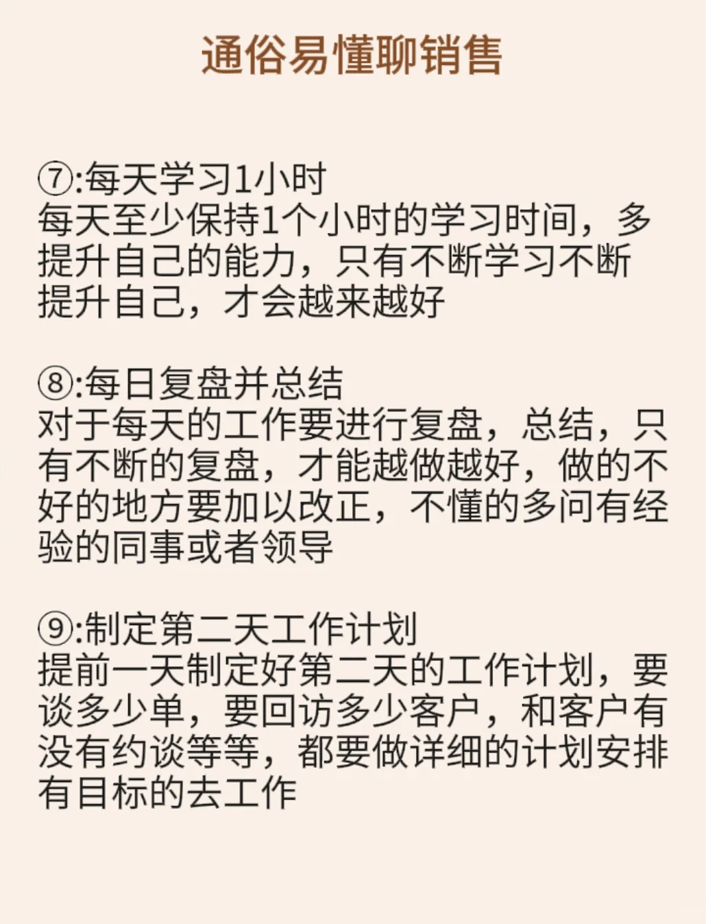 提前一天制定好第二天的工作计划,要谈多少单,要回访多少客户,和客户有没有约谈等等,都要做详细的计划安排有目标的去工作