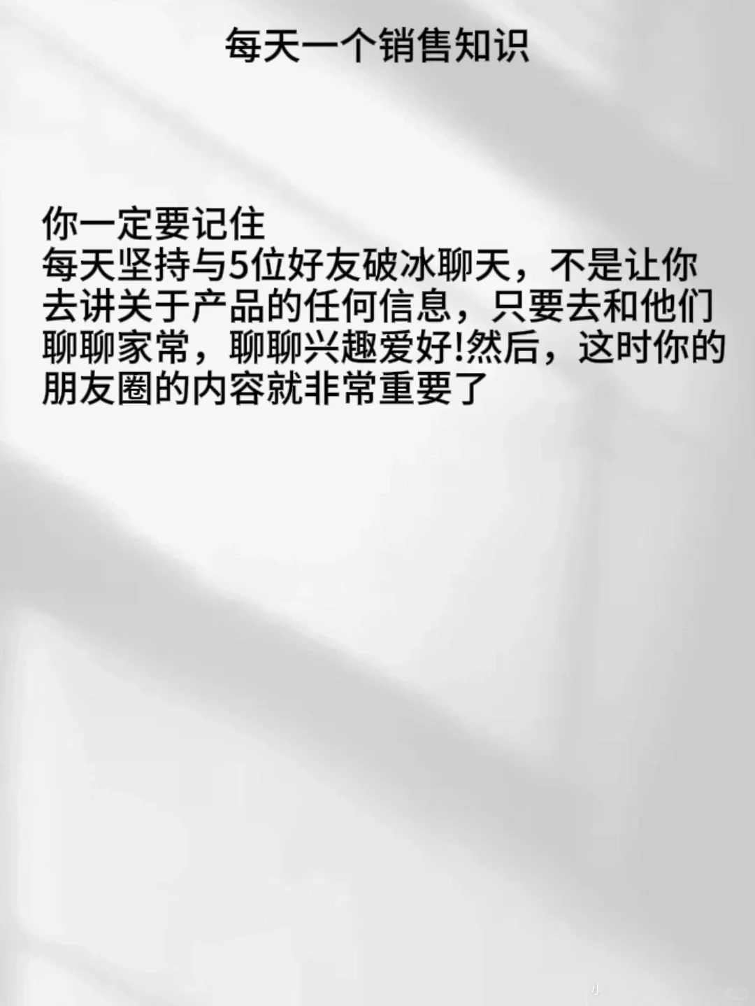 🔆添加客户后,你们是不是还在一上来就说我是xxx吗? 🤔如何让顾客认识你,并且记住你? . 🔷教你这样说: 感谢你的信任,并且愿意添加我,以后有任何需求都可以来找我,我会尽我所能为你服务。非常高兴能够交到您这个朋友 . 📍记住: 千万不要马上去推荐产品,因为这样的话下一秒你可能会被拉黑,也不要什么都不说,这样的话你很快就会被遗忘掉 . ‼️你一定要记住 每天坚持与5位好友破冰聊天,不是让你去讲关于产品的任何信息,只要去和他们聊聊家常,聊聊兴趣爱好!然后,这时你的朋友圈的内容就非常重要了