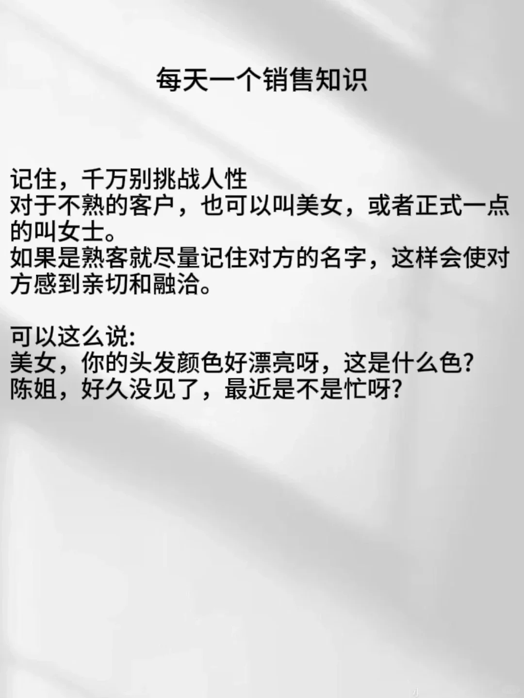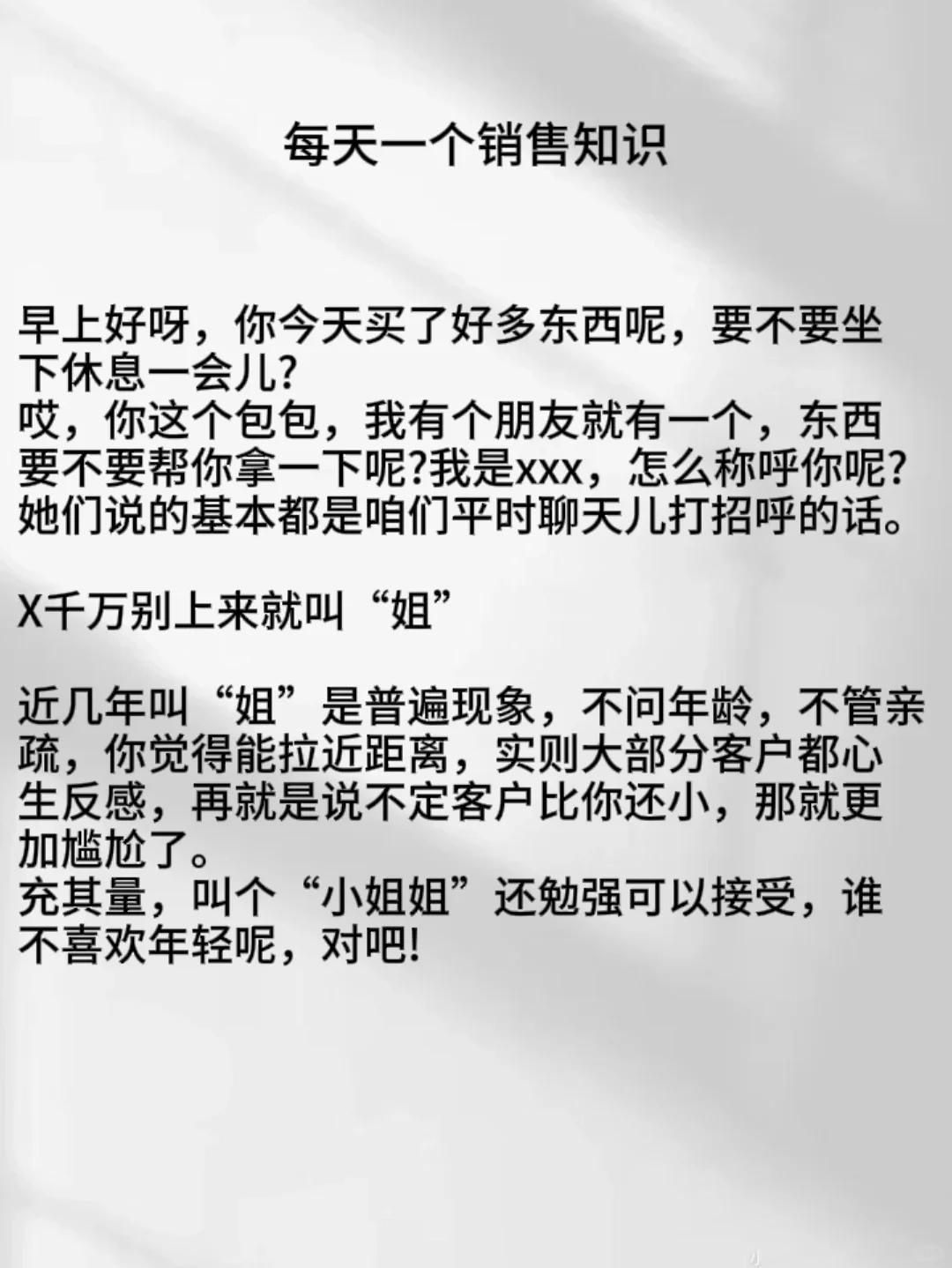 💎第一句话千万不要再叫“哥或姐”了!好的销售一定不会一上来就立马介绍产品的,他们会用夸赞和引导的方式先了解对方的身份,拉近距离感。