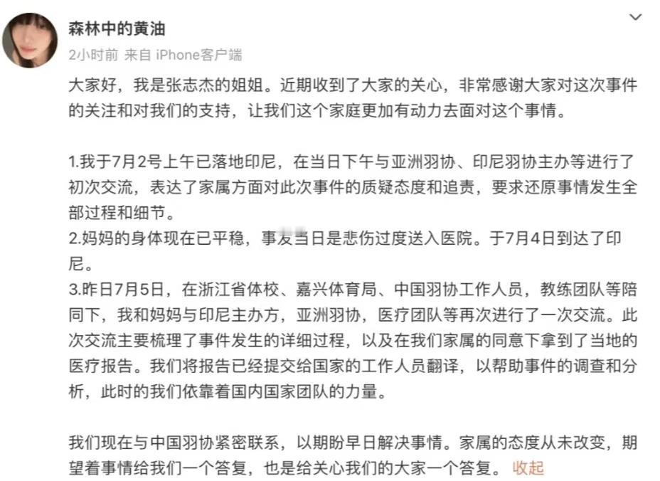 羽毛球运动员张志杰猝死事件,印尼羽协处理结果有六个想不到: 1、想不到,印尼羽协对国际羽联要求彻查事件原因的要求,竟然如此不重视、不在乎。 2、想不到,印尼羽协对张志杰的家属、中国队教练组、浙江嘉兴体育局等有关人员如此冷酷无情。 3、想不到,前后两周的时间,中方也没有等到一个公平公正、实事求是的调查结果。 4、想不到,饱受痛苦的张志杰家属,最后等到的是印尼羽协放弃等待和撤回事件处理团队的决定。 5、想不到,张志杰的遗体,已经在印尼当地医院放了半个月。 6,想不到,中方众多人员在印尼的15天工作,竟然没有得到一个完整的答案。