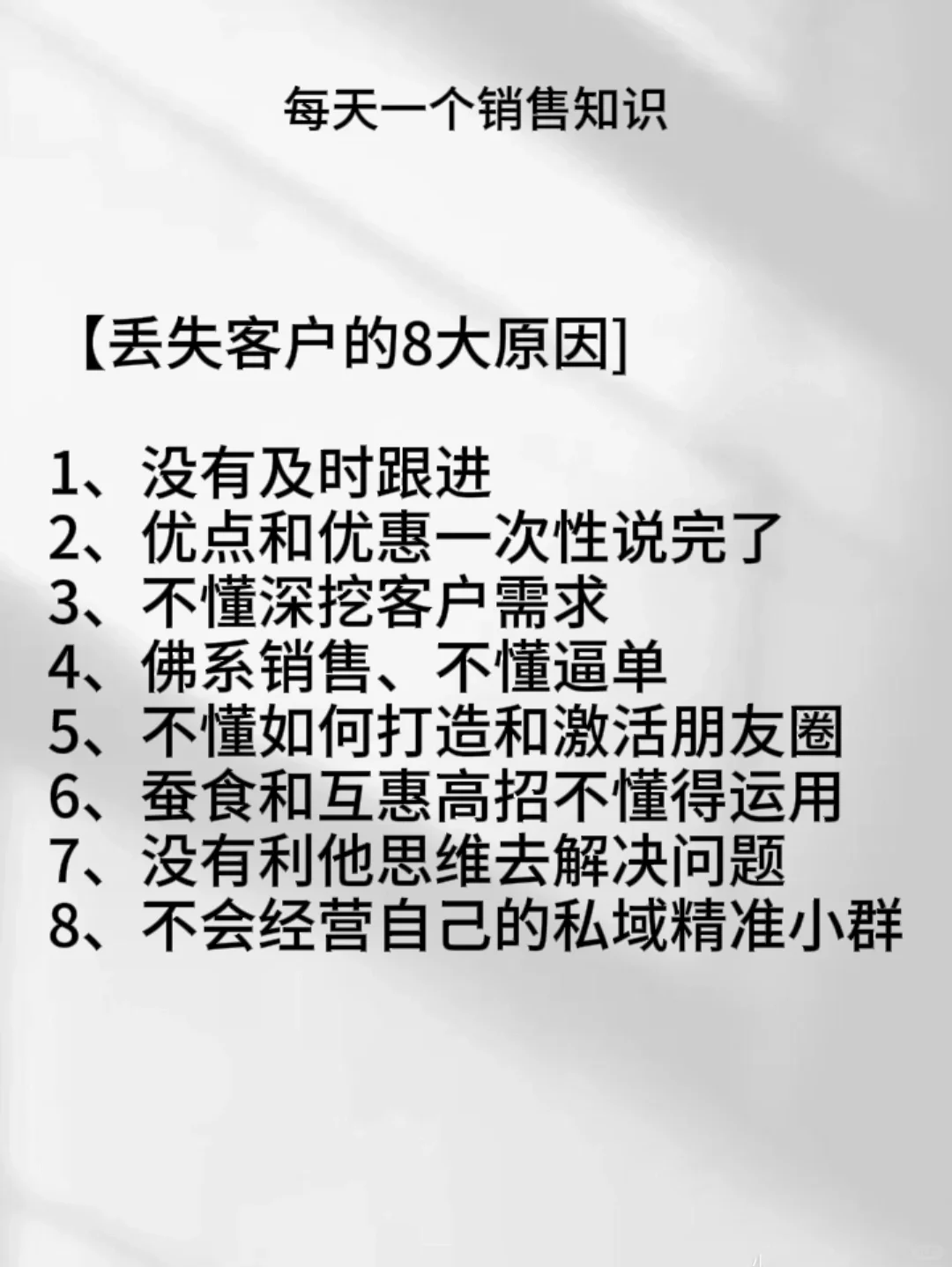 【丢失客户的8大原因】 1、没有及时跟进 2、优点和优惠一次性说完了 3、不懂深挖客户需求 4、佛系销售、不懂逼单 5、不懂如何打造和激活朋友圈 6、蚕食和互惠高招不懂得运用 7、没有利他思维去解决问题 8、不会经营自己的私域精准小群 -