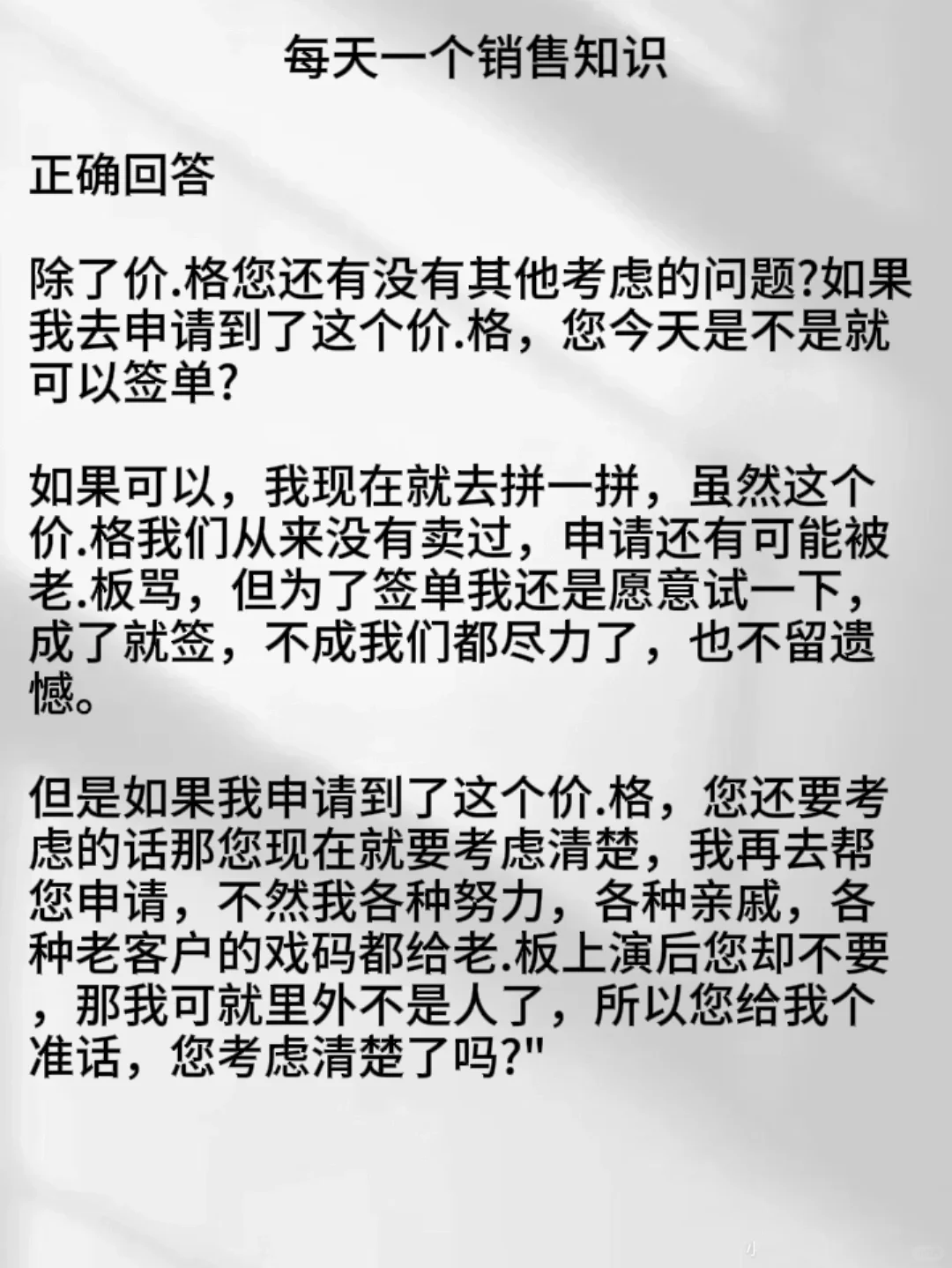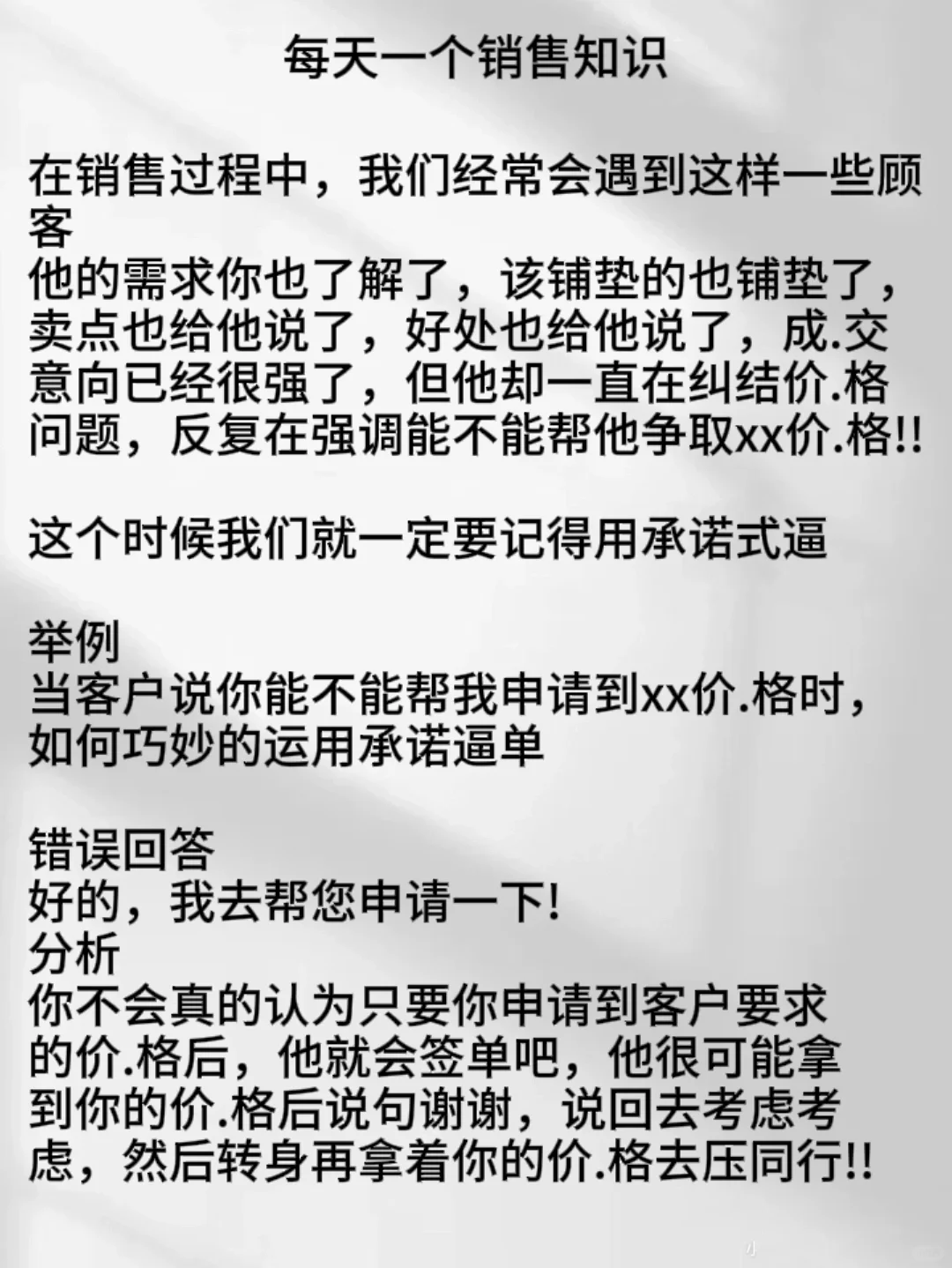 🎈在销售过程中,我们经常会遇到这样一些顾客,他的需求你也了解了,该铺垫的也铺垫了,卖点也给他说了,好处也给他说了,成.交意向已经很强了,但他却一直在纠结价.格问题,反复在强调能不能帮他争取xx价.格!! 🎈这个时候我们就一定要记得用承诺式逼单 -