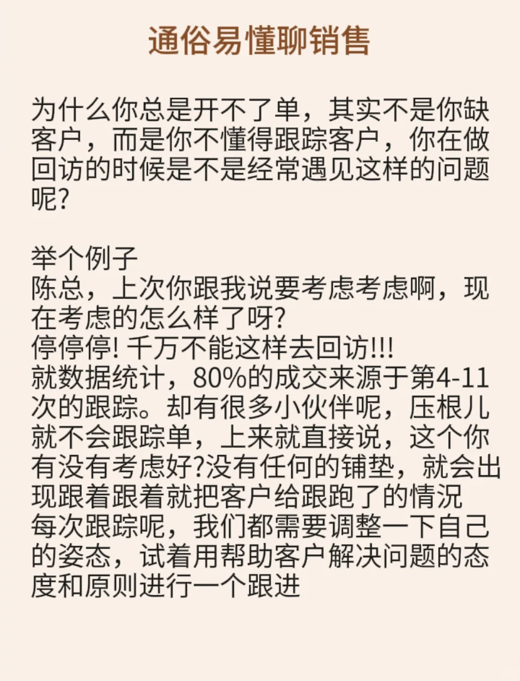 为什么你总是开不了单,其实不是你缺客户,而是你不懂得跟踪客户,你在做回访的时候是不是经常遇见这样的问题呢? 👇举个例子 💡陈总,上次你跟我说要考虑考虑啊,现在考虑的怎么样了呀? ‼️停停停! 千万不能这样去回访!!! 🔥就数据统计,80%的成交来源于第4-11次的跟踪。却有很多小伙伴呢,压根儿就不会跟踪单,上来就直接说,这个你有没有考虑好?没有任何的铺垫,就会出现跟着跟着就把客户给跟跑了的情況每次跟踪呢,我们都需要调整一下自己的姿态,试着用帮助客户解决问题的态度和原则进行一个跟进