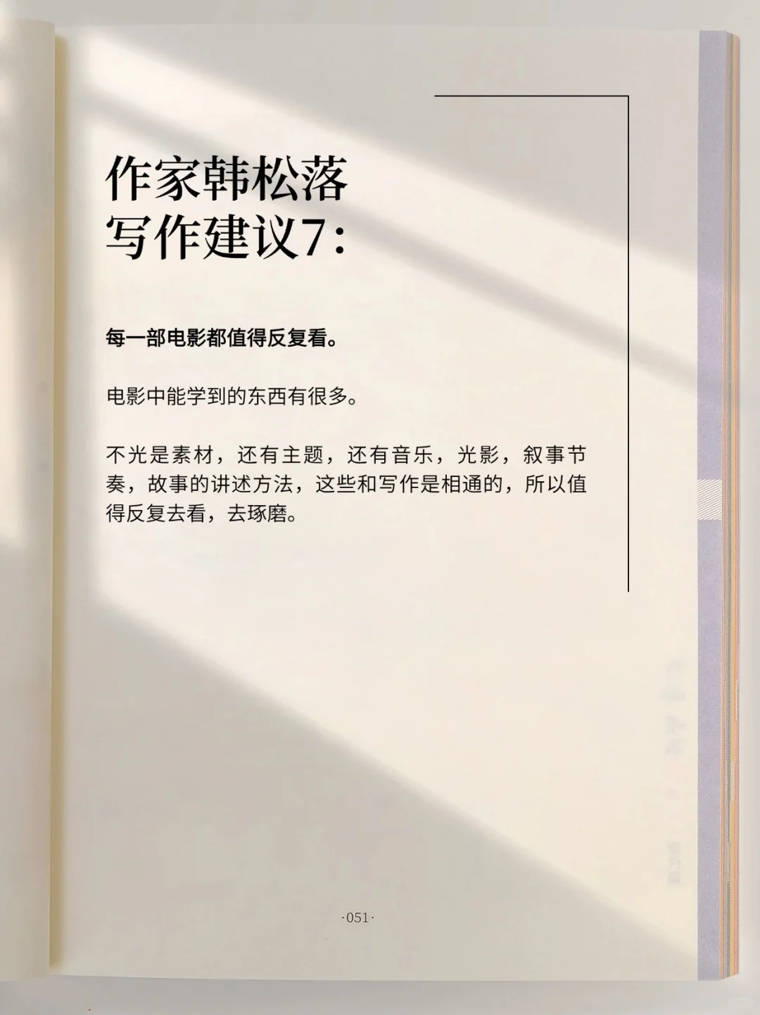 周六晚上看了一场作家之间的对谈,真的太太太绝了‼️信息量超大[赞R],作为一名写作爱好者,收获了很多关于写作的干货和经验。作家蓑依是以提问者的角色、作家韩松落是回答者的角色,两位老师都非常非常的真诚在分享自己对于阅读写作的理解。看的时候真的是狂记笔记。点点都戳我‼️ . 整理了8点特别有感触的写作心得,一起看下~ 1️⃣发现并强化自己的感受力 韩松落老师强调感受力的重要性。感受力不jin限于艺术和文学,还包括生活中的方方面面。像韩老师自己,对气味和颜色会感受更强一些,他就在作品中体现出来了,找到并强化自己的独特感受力,可以为写作提供独特的视角。 . 2️⃣随时随地记录素材,不要局限形式 不管是读纸质书,电子书,还是网络上的一点片段,只要你觉得对自己有帮助,就记下来,不要纠结工具,任何的形式,方便自己查找就可以。还有一个方式是韩老师非常建议的:录音。他说到了有一次,碰到了一个人,他讲了自己的很多有意思的事,和那个人分别之后,他马上拿出了录音机,把这些事记录了下来,录音有一个好处,就是能把当时自己的情绪,感受更直观的表达出来。 . 3️⃣定期整理素材库(可以一周整理一次) 千万别小看这一点,这可能比记录素材更重要。我之前就没有整理的习惯,导致那些素材一直在吃灰哈哈哈哈。定期整理时,你会发现一些新的想法,就可以直接写成文章了。 . 4️⃣学会“养”文章 听到这个点的时候,真的是眼前一亮。“养”文章的意思是,不要有那种一次就要写完一篇好作品的心态,只要你有任何想法,或者灵感,就及时写下来,哪怕只有1-2句话也没事。后面当你看到和这个片段或句子共通的素材时,就把它填进去。慢慢的,一个小片段就能长成一个大故事了。 . 5️⃣用音乐的节奏去写作 韩松落老师讲到,他有时会用音乐作品的方式来完成一篇文章,就是他所说的:软结构。讲到这个点,我就想到了作家余华有本书《音乐影响了我的写作》,这个点提供了一种比较新颖的写作方法,下次我准备找一首自己喜欢的音乐来试试。 . 6️⃣学会用电影的视角去构建画面 在直播中,韩松落老师讲到,有时候大家会有这样的困惑,想要描述一个场景,不知道怎么下手,先写什么,再写什么。这个时候电影就可以发挥用处了,想象你看过的电影中,摄影机是怎么拍摄的。当然,这就需要你在看电影的时候多花心思去记录。 . 7️⃣每一部电影都值得反复看。 8️⃣系统阅读和碎片化阅读同时进行。 字数有限,放在图片中了。 赶紧实操起来吧~