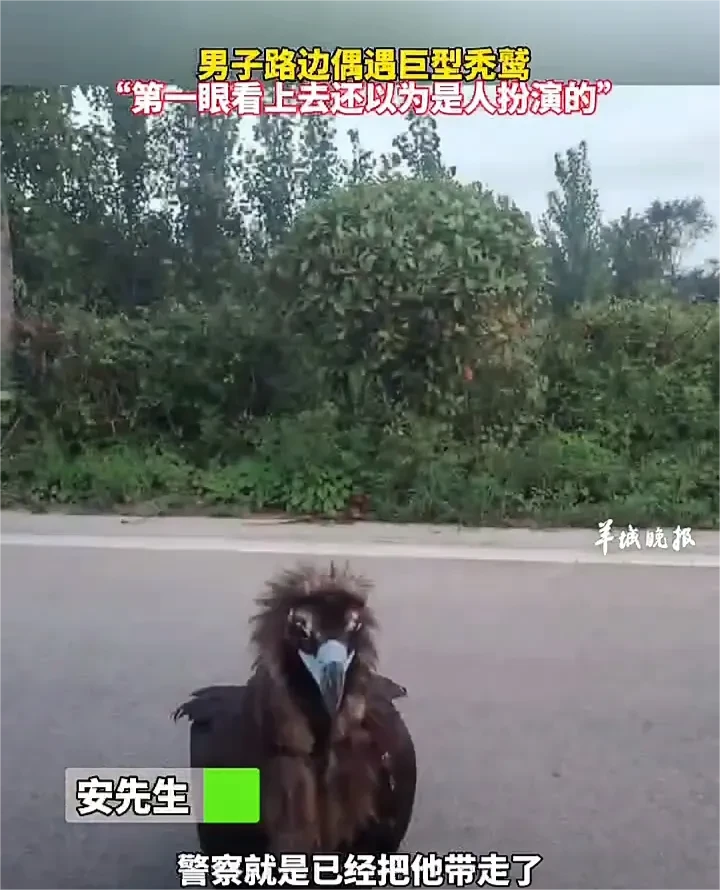 近日,山东日照一名男子回家路上,遇到一只巨型秃鹫正在散步。起初男子以为这只秃鹫是人扮演的,因为它走路的姿势很像是人,后来才得知那是真的,并且附近的居民已经报警了,最后这只秃鹫被民警带走了。