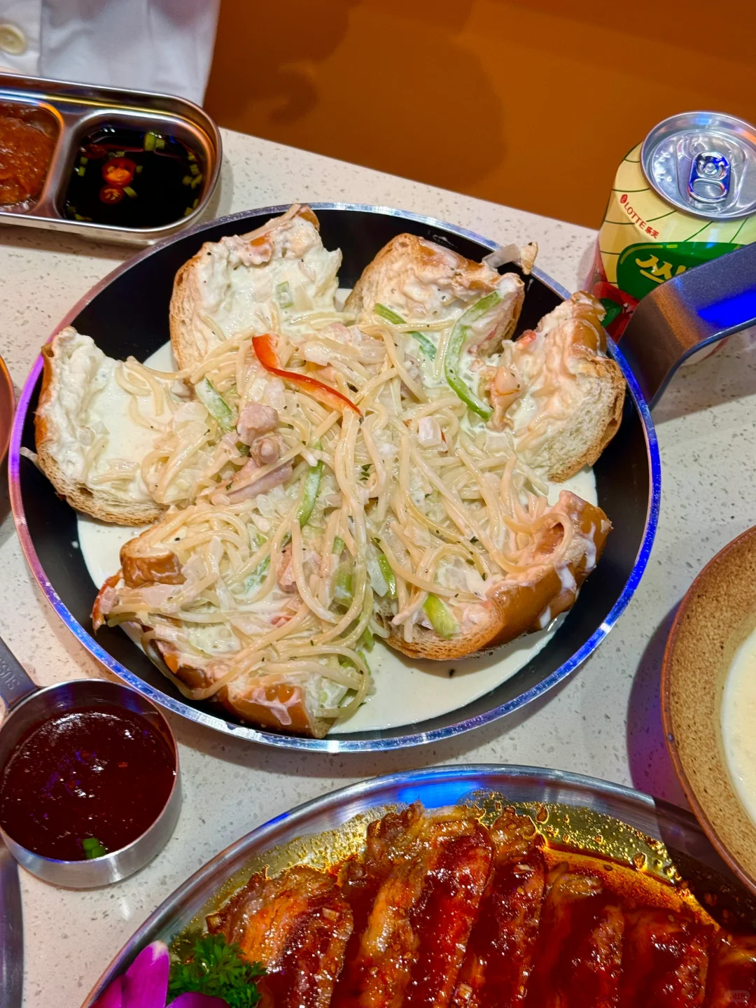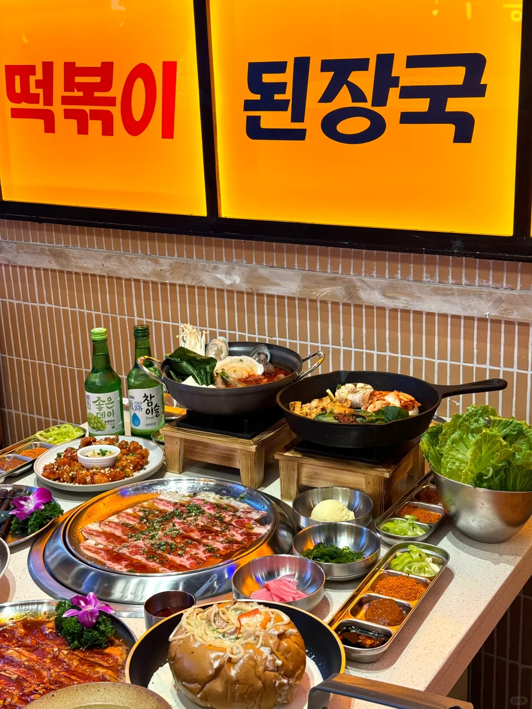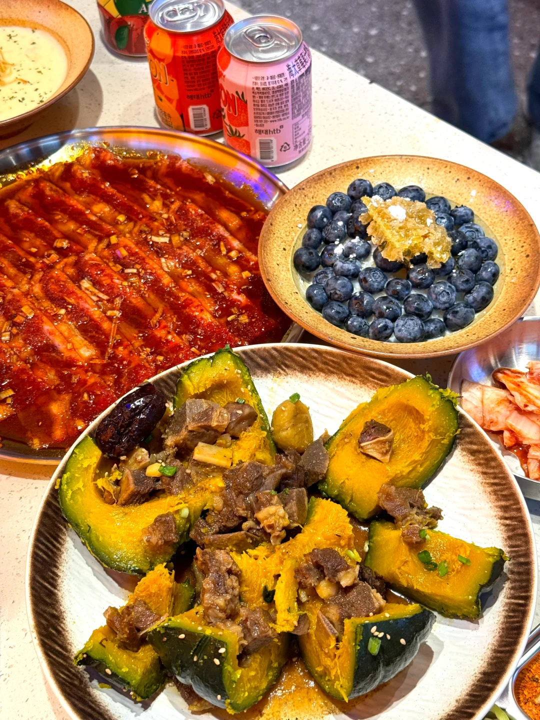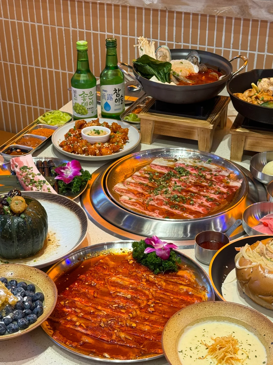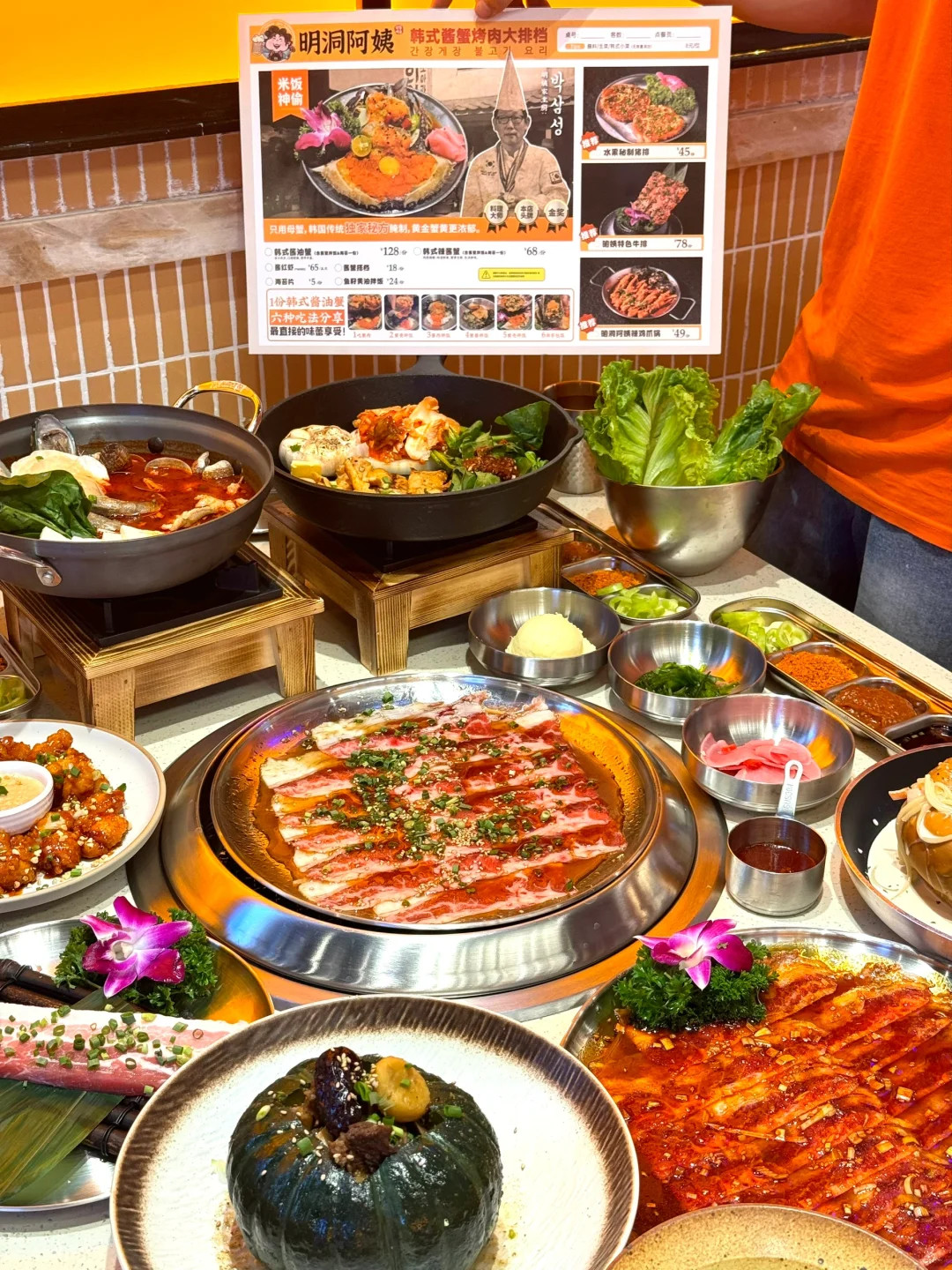 终于来打卡被安利了N次的明洞阿姨了 亮橙色的装修超治愈 拍照彷佛自带打光📸 明姨老式肥瘦和秘制吾格桑🥩真的太对我口味了 肉质鲜嫩 还有小哥帮忙烤 不用担心火候把握不好 银鱼酱炭烤猪颈肉和海鲜辣火锅加了韩式辣椒粉 香喷喷的超下饭 南瓜牛排和面包奶油意面像开盲盒一样 剪开之后别有洞天 创新💯 必点女孩子们都很爱的雪冰🍧 里面加了蜂巢和超多蓝莓🫐颜值又高又好吃 还有敲多创意韩餐 快带着你的饭搭子来恰💨