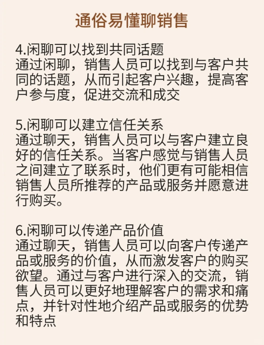 通过闲聊,销售人员可以找到与客户共同的话题,从而引起客户兴趣,提高客户参与度,促进交流和成交。
