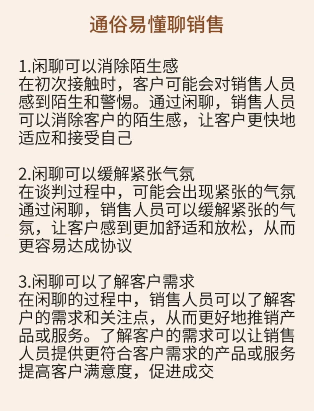 在谈判过程中,可能会出现紧张的气氛。通过闲聊,销售人员可以缓解紧张的气氛,让客户感到更加舒适和放松,从而更容易达成协议