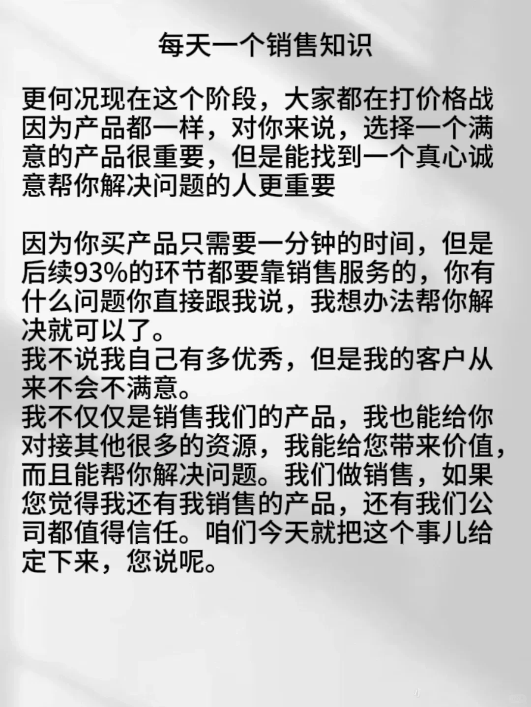 💎我不仅仅是销售我们的产品,我也能给你对接其他很多的资源,我能给您带来价值,而且能帮你解决问题。我们做销售,如果您觉得我还有我销售的产品,还有我们公司都值得信任。咱们今天就把这个事儿给定下来,您说呢。