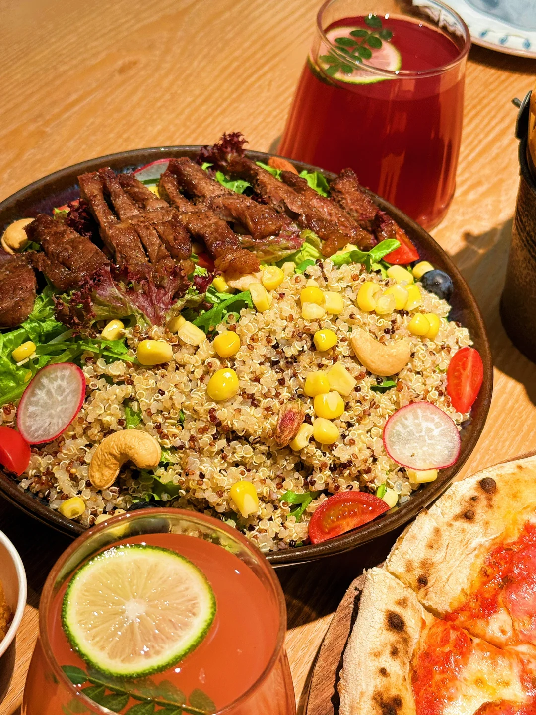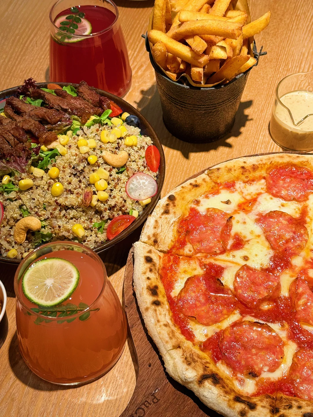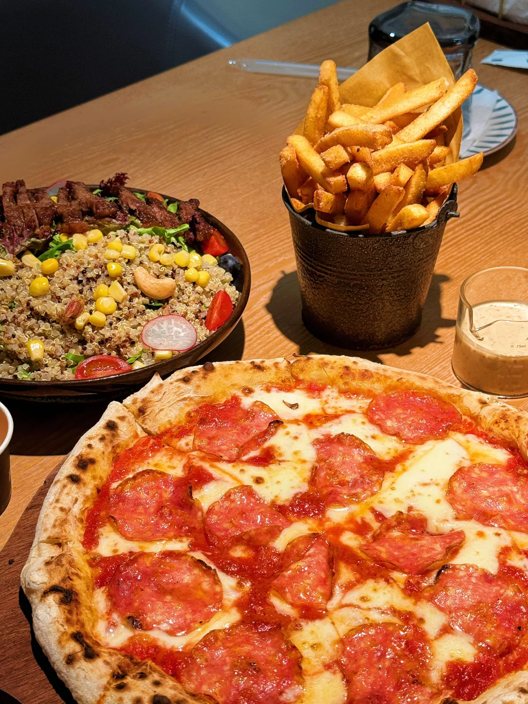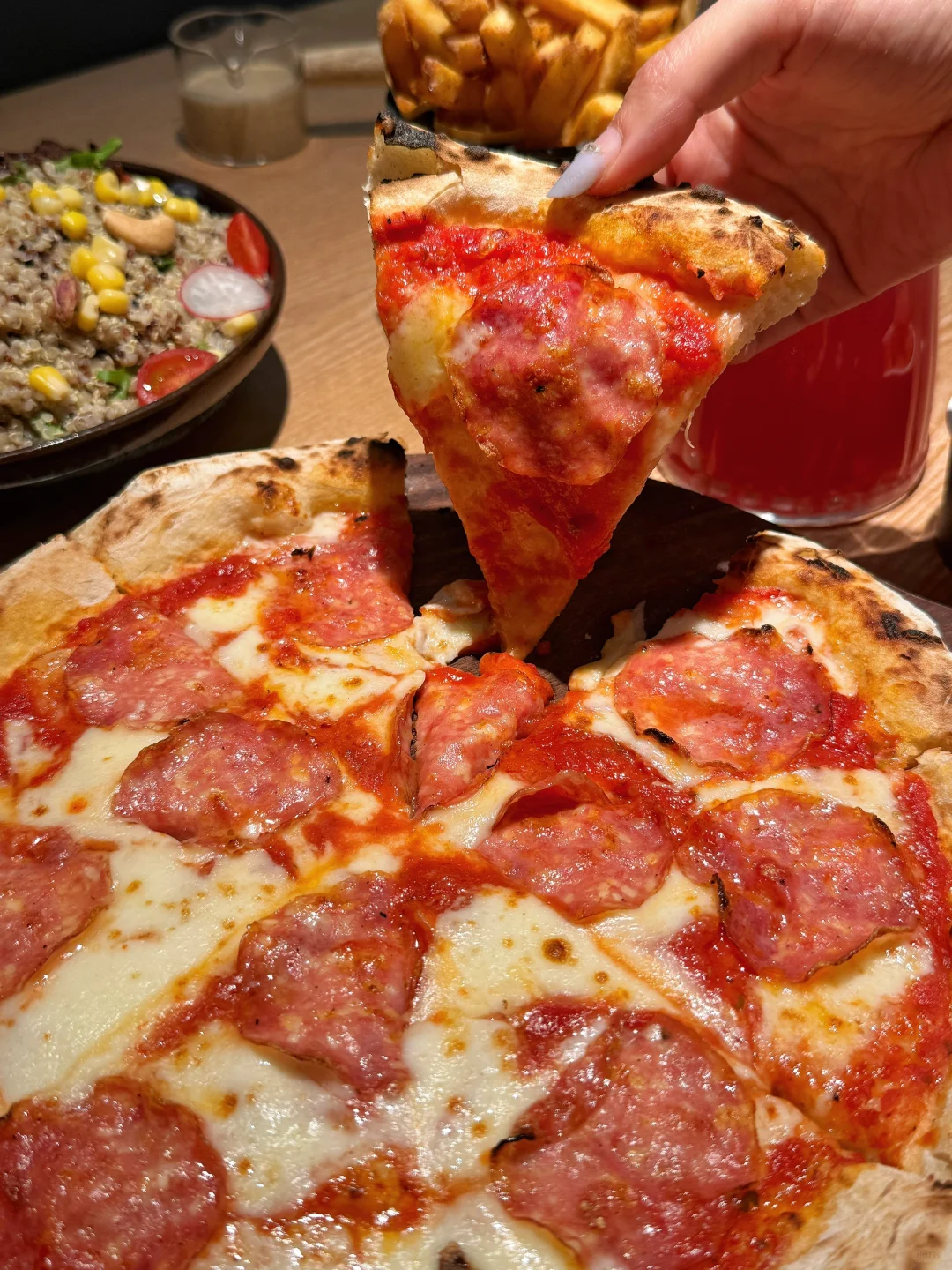 在济南几乎鲜少能吃到好吃的意式披萨 PuCibo还是小伙伴疯狂安利的 果断来尝尝🥰 萨拉米披萨🍕:尊嘟好吃!边缘微酥 芝士浓郁 搭配萨拉米香肠和番茄酱 碳水的快乐能量顺便达标✅ 甘梅粉薯条🍟:我太爱了!还跟小哥哥要了份黑松露酱 蘸着吃绝了! 牛排藜麦沙拉🥗:减脂星人必点 虽然是沙拉 但牛排口味一点不输 藜麦也很香 而且他家都是进口食材现点现做,无预制菜这点我就很满意~💕 环境也hin不错 温馨安静 拍照📸也嘎嘎好看 真真儿约会首选✨