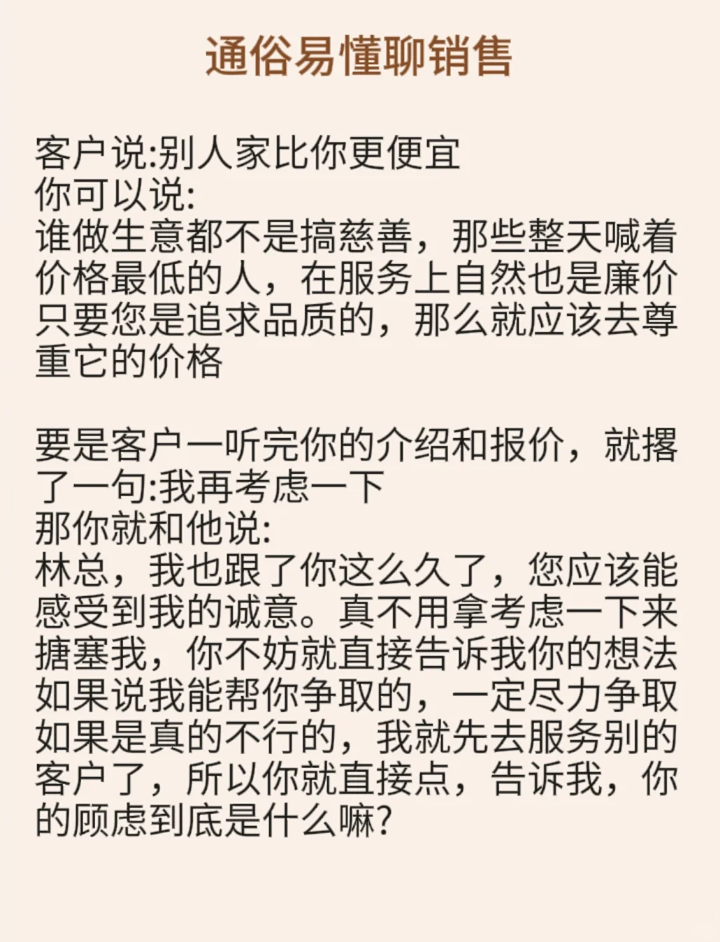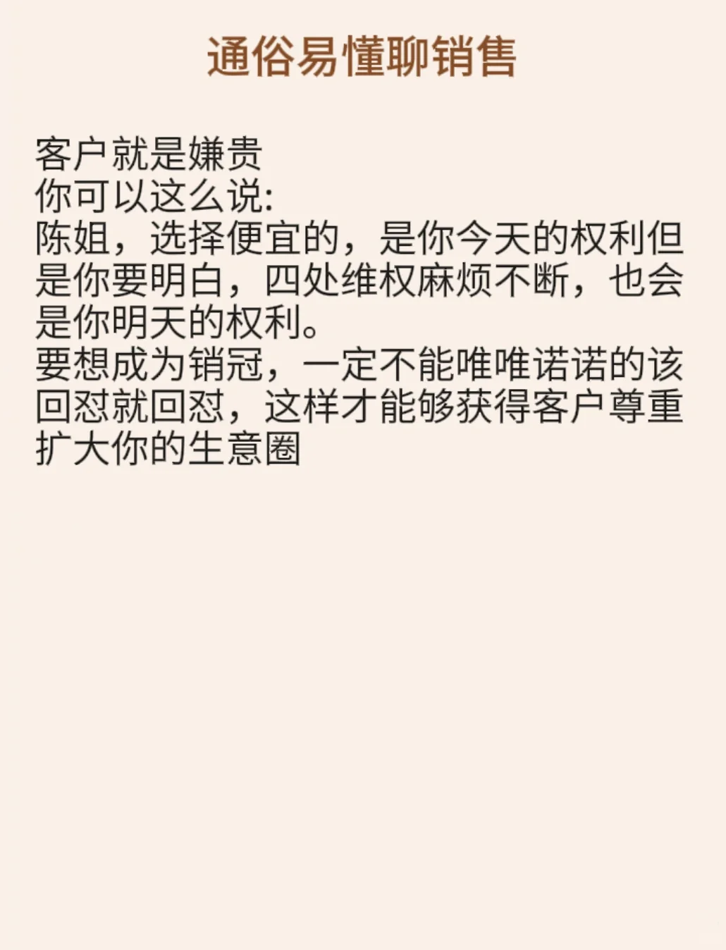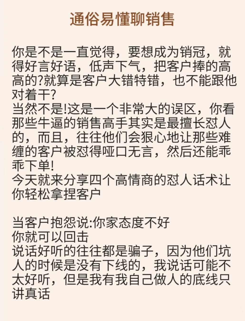 你是不是一直觉得,要想成为销冠,就得好言好语,低声下气,把客户捧的高高的?就算是客户大错特错,也不能跟他对着干? ‼️当然不是!这是一个非常大的误区,你看那些牛逼的销售高手其实是最擅长怼人的。而且,往往他们会狠心地让那些难缠的客户被怼得哑口无言,然后还能乖乖下单! 🔆今天就来分享四个高情商的怼人话术让你轻松拿捏客户
