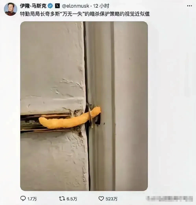 马斯克不愧是阴阳大师,直接正面怒怼特勤局女局长!女局长辩解说,杀手潜伏地点的斜坡过于陡峭,不便安排特勤人员。马斯克随即晒出白宫屋顶的特勤部署照片,附言:“这里的斜坡角度似乎也很大”。 女局长坚称,他们给予特朗普的保护是滴水不漏的,因为没有任何意外发生。马斯克回应时,贴出一张薯条充当门栓的照片,配文:“这就是特勤局所谓的‘滴水不漏暗杀防护’形象描述”。哈哈,不知道马斯克是专门请摄影师拍摄的,还是从网络上找到的,总之非常恰当。看来,川普他是罩定了!