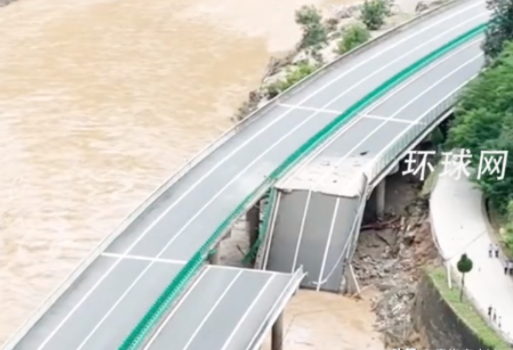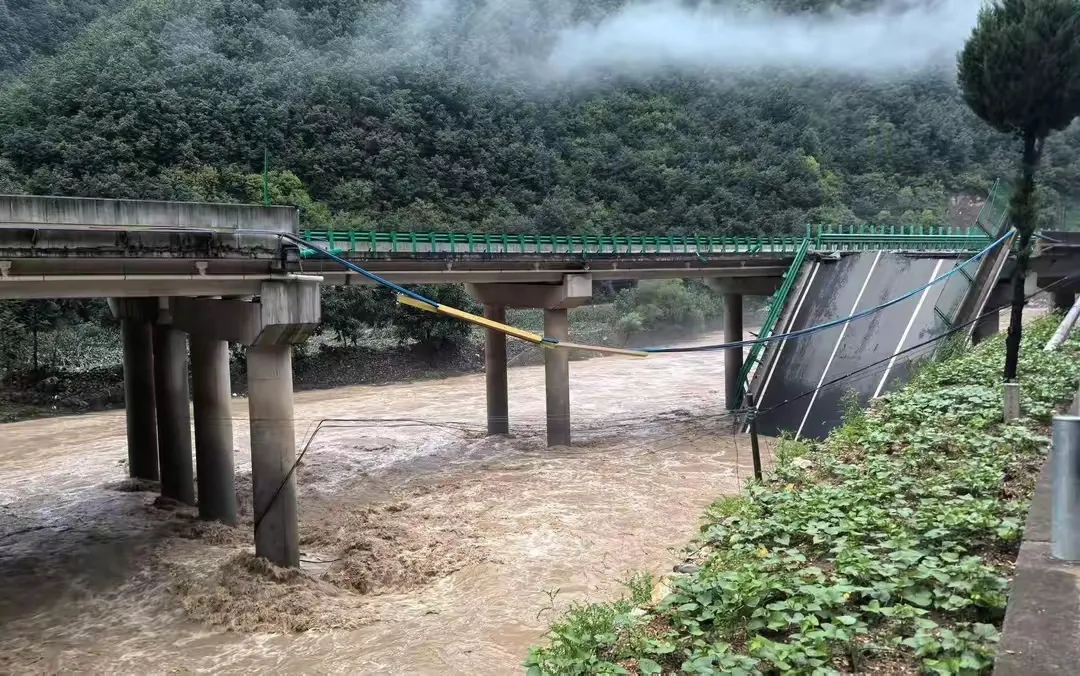 环球网发的那个无人机航拍图,一眼就能看出严坪村二号桥是靠近岸边那一边塌了,不是在河中央,桥面塌了大概40米长。 金钱河的水位降了不少,掉下去的车都露出来了。 不止是桥塌了,旁边的省道色杏路那边的护坡也垮了一块,从下面看,河水涨的时候留下的痕迹清清楚楚。