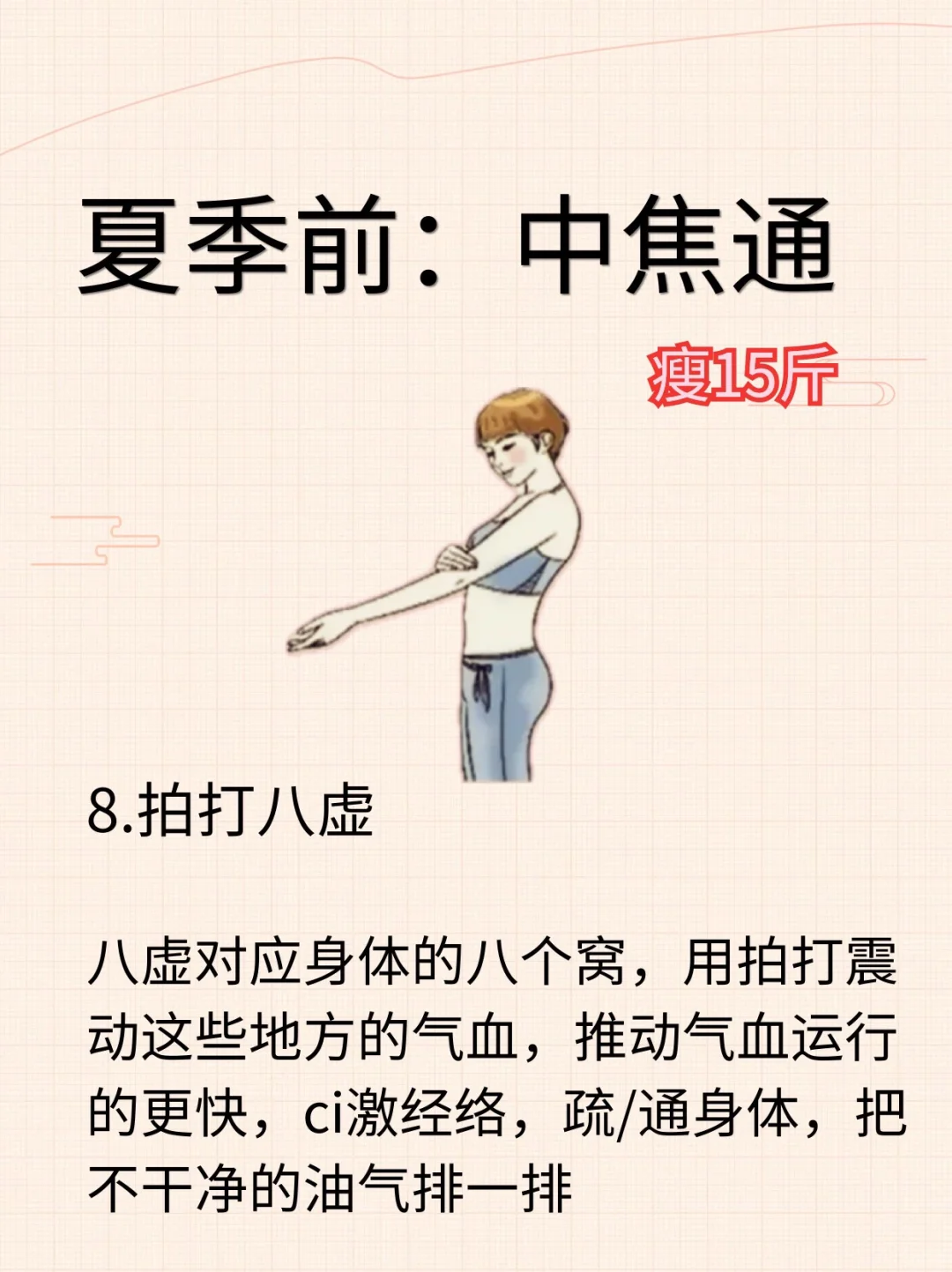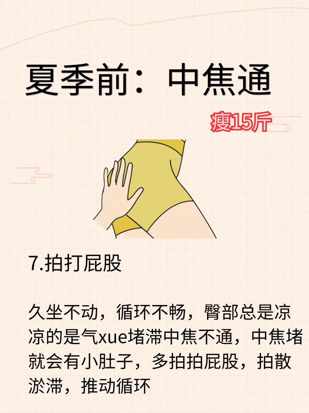 中焦,就像是人体的交通枢纽,如果它不通畅,那可就麻烦啦❗ 中焦不通会导致身体的代谢变慢,就像堵车一样会垃圾和du素排不出去,久而久之堆在体内,形成肥胖,中焦不通还会影响我们的消化系统,让我们吃进去的食物不能很好地被消化和吸收,进一步加重淝胖问题 有没有发现,中焦不通的宝子,往往肚子上的🥩比较多! 一起打通中焦嘎嘎掉秤吧❗ 1、金刚跪 2、泡脚 3、推腹部 4 、揉脚掌心 5 、金鸡D立 6 、双脚踮跟 7、拍打屁股