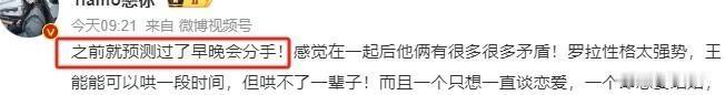 最近,一对网红情侣的分手在网上掀起了轩然大波。王能能和罗拉,这对在恋爱综艺《半熟恋人》中甜蜜出圈的情侣,竟然因为对未来的规划不同而分道扬镳了!罗拉想结婚,王能能却还想继续谈恋爱。分手后,罗拉直接把社交平台上和王能能有关的内容全删了,还发了条意味深长的动态。 可事情并没这么简单。王能能突然爆出了恋爱期间的各种花销,从买房基金到社保,事无巨细地列了出来。这下可好,网友们都炸锅了!有人说王能能这么做太low,有人觉得他说出这些很正常。 这场分手drama不仅涉及感情纠葛,还牵扯到了经济问题、价值观差异,甚至引发了对网红恋情真实性的质疑。到底谁对谁错?让我们一起来扒一扒这场分手风波背后的故事! 王能能与罗拉的分手事件引发了广泛关注。这对在恋综节目《半熟恋人》中备受瞩目的情侣,因对未来规划的分歧而选择分道扬镳。罗拉删除社交平台上与王能能相关的动态,随后发文暗示两人在爱情观上存在差异。她希望步入婚姻,而王能能则想继续恋爱。 分手消息一出,网友们纷纷表达自己的看法。有人对罗拉的决定表示理解和支持,认为她勇于追求自己想要的生活。也有人对这段感情的结束感到惋惜,认为两人曾经的甜蜜让人羡慕。 王能能在回应中提到了与罗拉交往期间的经济开销,这一做法引发了争议。他列出了恋爱后增加的开支,包括买房基金、社保等。部分网友认为这种"算账"行为有失风度,感情不应该用金钱衡量。另一部分人则表示理解,认为经济付出也是感情中的重要组成部分。 [这种行为真的很low,分手了就好聚好散,何必这样] [男生付出很多也是正常的,但是不应该在分手后拿出来说] [感情是两个人的事,不应该把经济问题摆在台面上] 罗拉作为一个小网红,有独立的经济能力。许多网友认为,如果王能能无法提供稳定的未来,就不应该找借口。罗拉的独立和坚强赢得了不少人的同情和支持。 [罗拉自己也有工作,不需要依靠男人] [女生也要有自己的事业,不能完全依赖对方] 这起分手事件引发了人们对恋爱观的深入思考。有人认为,在恋爱中应该注重精神层面的契合,而不是过分计较物质付出。也有人指出,现实生活中的经济问题不容忽视,需要双方共同面对。 [恋爱不是只有甜蜜,还要考虑现实问题] [感情和现实应该平衡,不能只看重一方面] 王能能和罗拉的故事反映了当代年轻人在感情中面临的困境。一方面,他们渴望纯粹的爱情;另一方面,又不得不考虑现实生活中的种种压力。如何在理想和现实之间找到平衡,成为许多人面临的难题。 [现在的年轻人压力太大了,连谈恋爱都要考虑这么多] [希望他们都能找到适合自己的另一半] 这起事件也引发了对网红恋情的讨论。有人质疑这类恋情的真实性,认为可能存在炒作的成分。但也有人指出,即使是网红,也有真挚的感情。如何看待公众人物的感情生活,成为一个值得探讨的话题。 [网红的感情真的可信吗?] [他们也是普通人,也有真感情] 王能能和罗拉的分手事件折射出当代社会中的多重矛盾。它不仅涉及个人感情,还牵涉到经济压力、社会期待等复杂因素。这个案例提醒我们,在处理感情问题时,需要全面考虑各种因素,不能简单化。 无论是恋爱还是分手,都需要双方互相尊重、理解。过分计较得失,可能会伤害彼此的感情。同时,在进入一段关系之前,清晰地沟通双方的期望和未来规划也很重要,这可以避免因价值观不同而导致的痛苦分离。 这个事件给我们的启示是:感情需要用心经营,但也不能忽视现实因素。在追求爱情的同时,保持独立人格和经济能力同样重要。只有这样,才能在感情中保持平等和尊重,构建健康长久的关系。