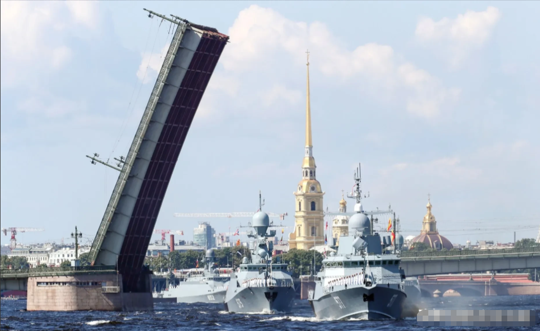 7月28号那天,普京总统在防长别洛乌索夫和海军总司令莫伊谢耶夫的陪同下,坐着“猛禽”号快艇,在涅瓦河上风光了一把,检阅了参加俄罗斯海军节的各国军舰。