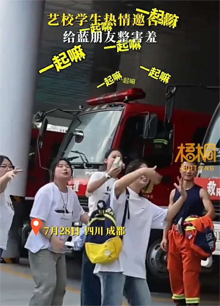 7月28日,四川成都一群艺校学生路过一处消防站,热情地邀请消防员们合影,消防员们见状害羞地不好意思上前,之后成功合影后又笑得合不拢嘴。对此网友们纷纷表示,“压住了高压水枪都压不住翘起的嘴角。”