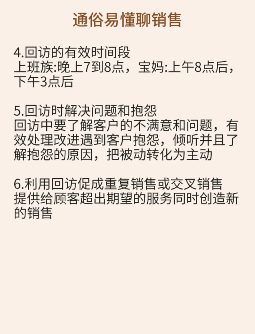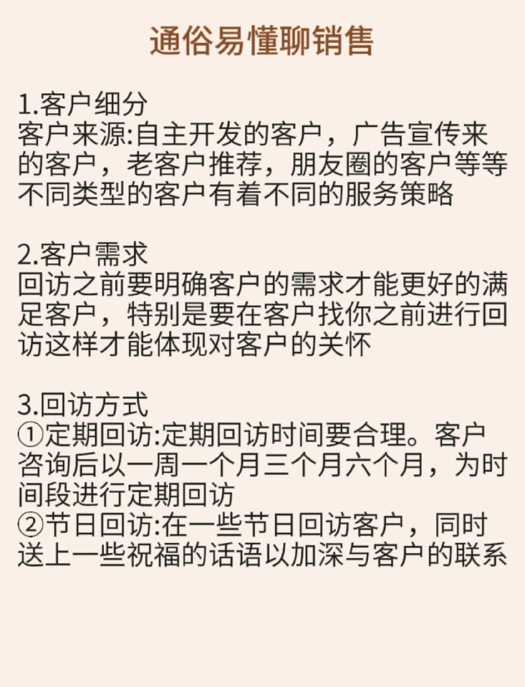 1.客户细分 客户来源:自主开发的客户,广告宣传来的客户,老客户推荐,朋友圈的客户等等不同类型的客户有着不同的服务策略 - 2.客户需求 回访之前要明确客户的需求才能更好的满足客户,特别是要在客户找你之前进行回访这样才能体现对客户的关怀 - 3.回访方式 ①定期回访:定期回访时间要合理。客户咨询后以一周一个月三个月六个月,为时间段进行定期回访 ②节日回访:在一些节日回访客户,同时送上一些祝福的话语以加深与客户的联系