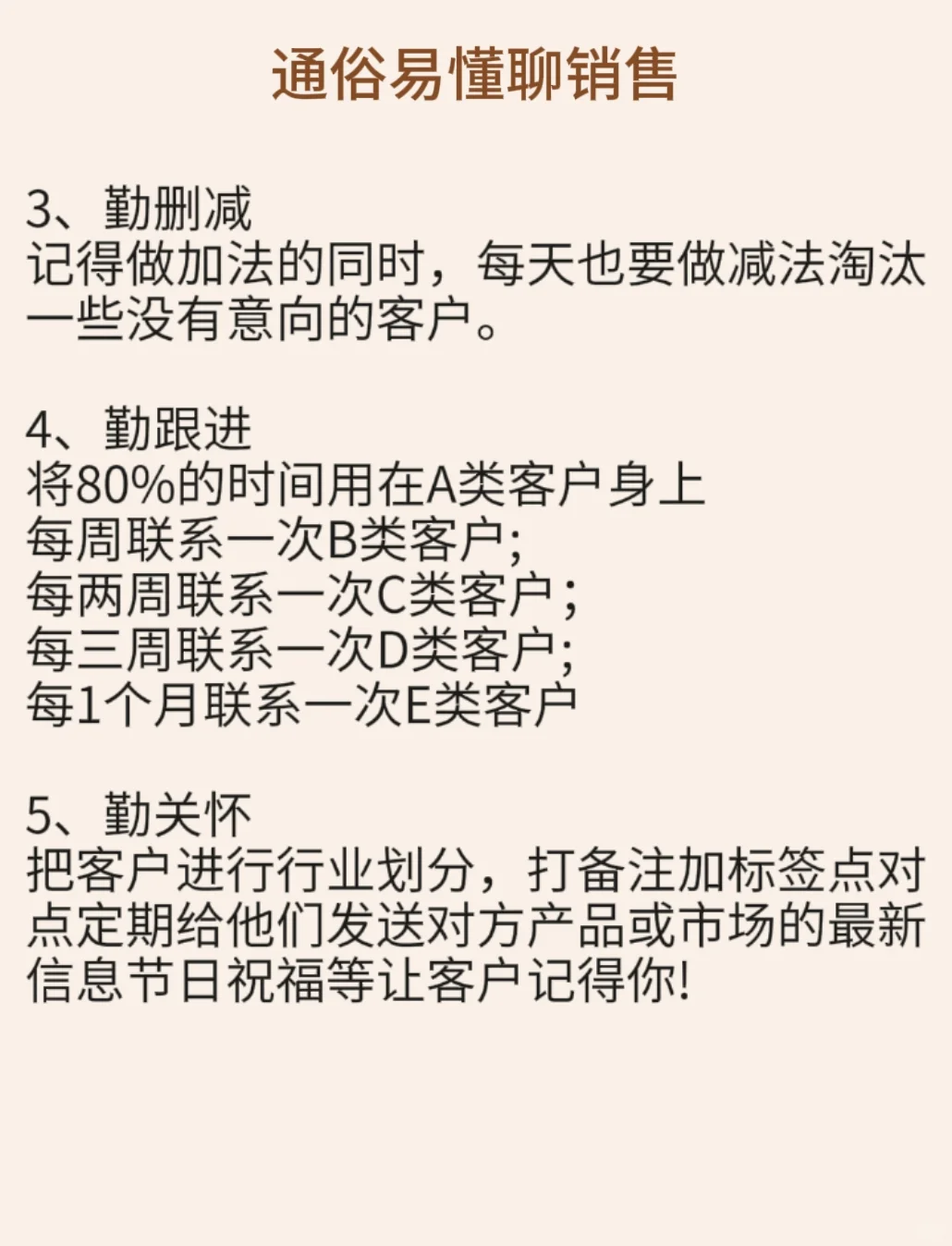 把客户进行行业划分,打备注加标签点对点定期给他们发送对方产品或市场的最新信息节日祝福等让客户记得你!