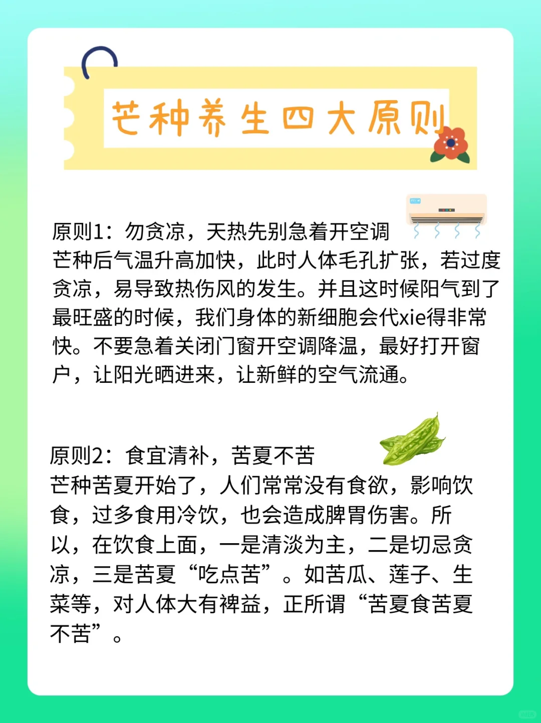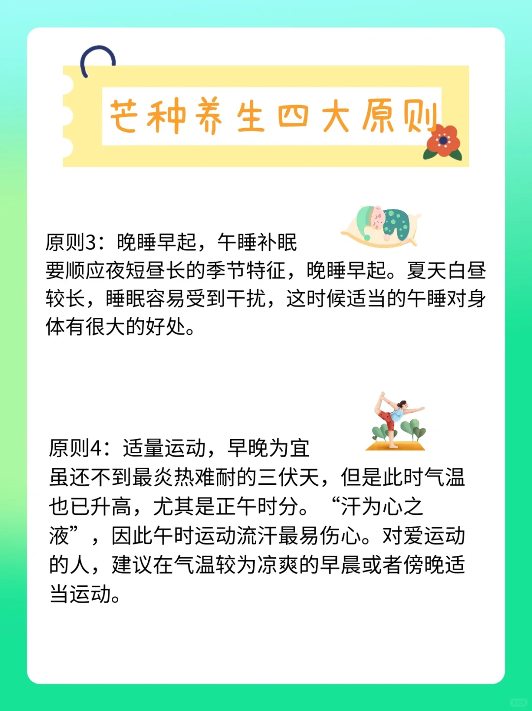 中翳:夏属🔥与心相应。“心者,生之本⋯.为阳中之太阳,通于夏气。”心为火脏,主一身之阳气,与夏气相 通。所以芒种节气,养 生重 点在于养心!该降心火了。 芒种养 生有4️⃣个原则: 原则1、勿贪凉,天热先别急着开空调 原则2、食宜清补,苦夏不苦 原则3:晚睡早起,午睡补眠 原则4:适量运动,早晚为宜 顺时养 生哟❗