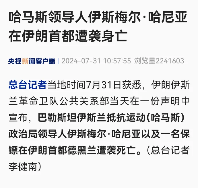 突发消息!巴勒斯坦伊斯兰抵抗运动(哈马斯)的政治局最高领导人伊斯梅尔·哈尼亚在伊朗首都德黑兰遭遇袭击身亡了。 这事儿一出,加沙人民的命运又成了一个大问号,中东局势估计又要乱成一锅粥了。 哈尼亚家族可谓满门英烈,他在之前的冲突中有近60名亲属丧生,包括三个儿子和几个孙子都在以色列对加沙地带的袭击中遇难。 哈尼亚这次去伊朗是为了参加新总统佩泽什基安的就职典礼,没想到观礼变成了自己的送葬仪式。 哈尼亚在伊朗首都遇袭身亡,这说明伊朗的安全防线已经被渗透得很严重,就像筛子一样漏洞百出。