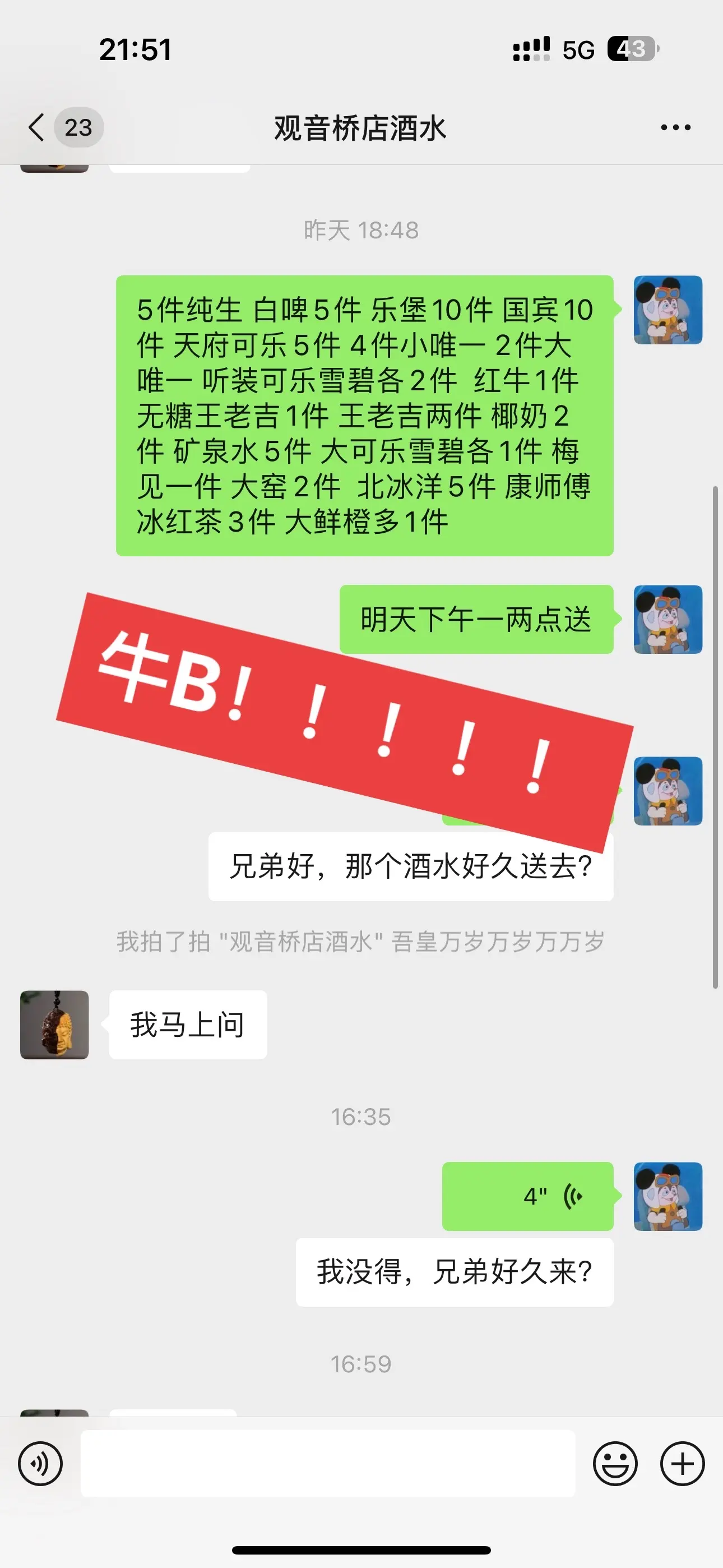 无语😓!是觉得生意太小了 还是这年头送酒水的都是大爷?前一天喊的酒水 第二天晚上都送不过来 问到就是问一哈 刚开始还回信息 最后语音不接 电话不接 信息也不回了 !我体会到了 “店大欺客”四个字的含义!
