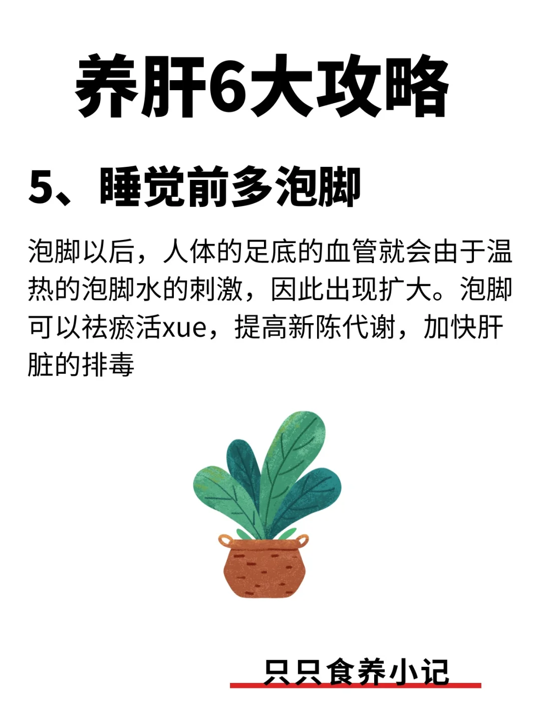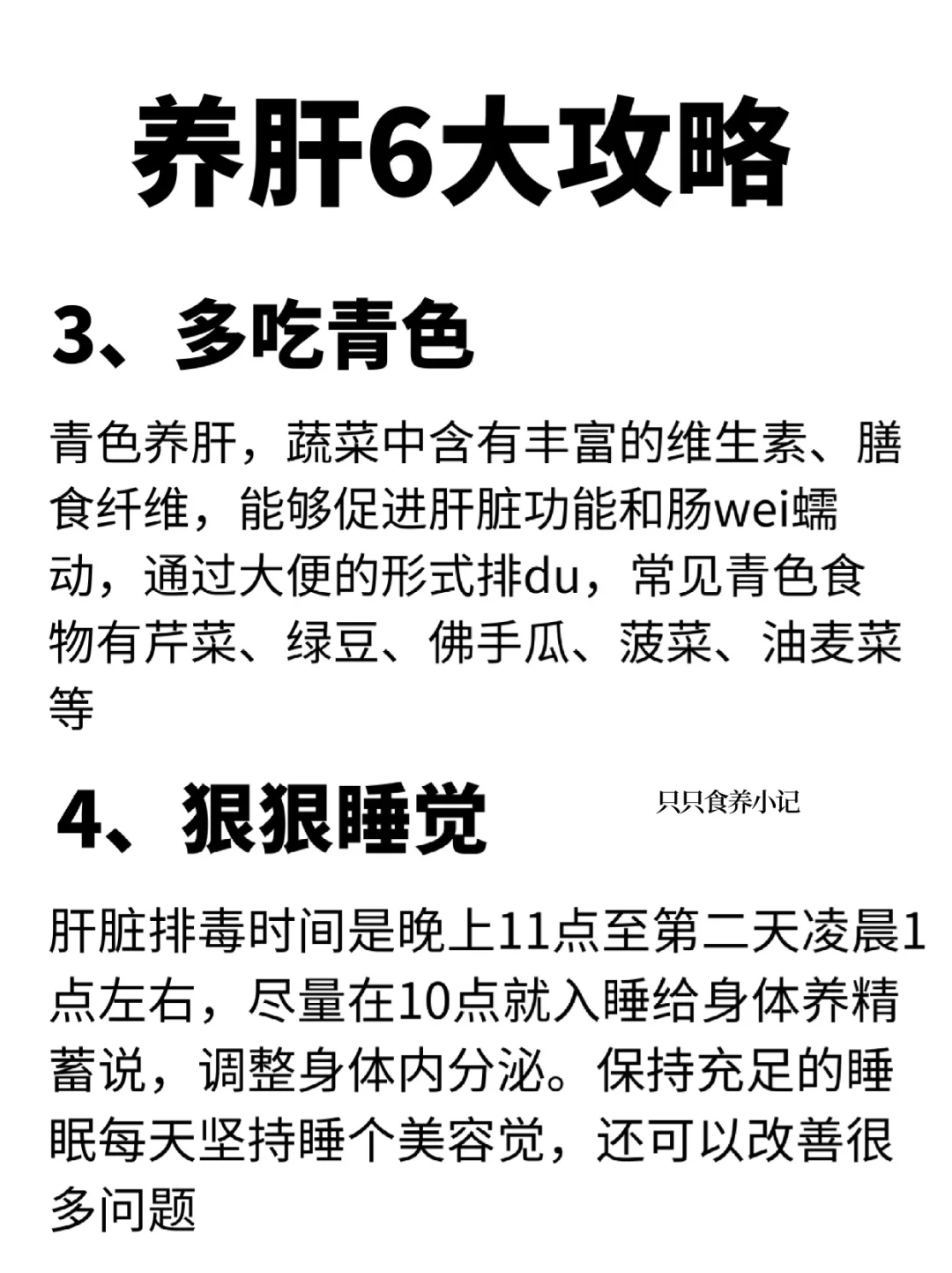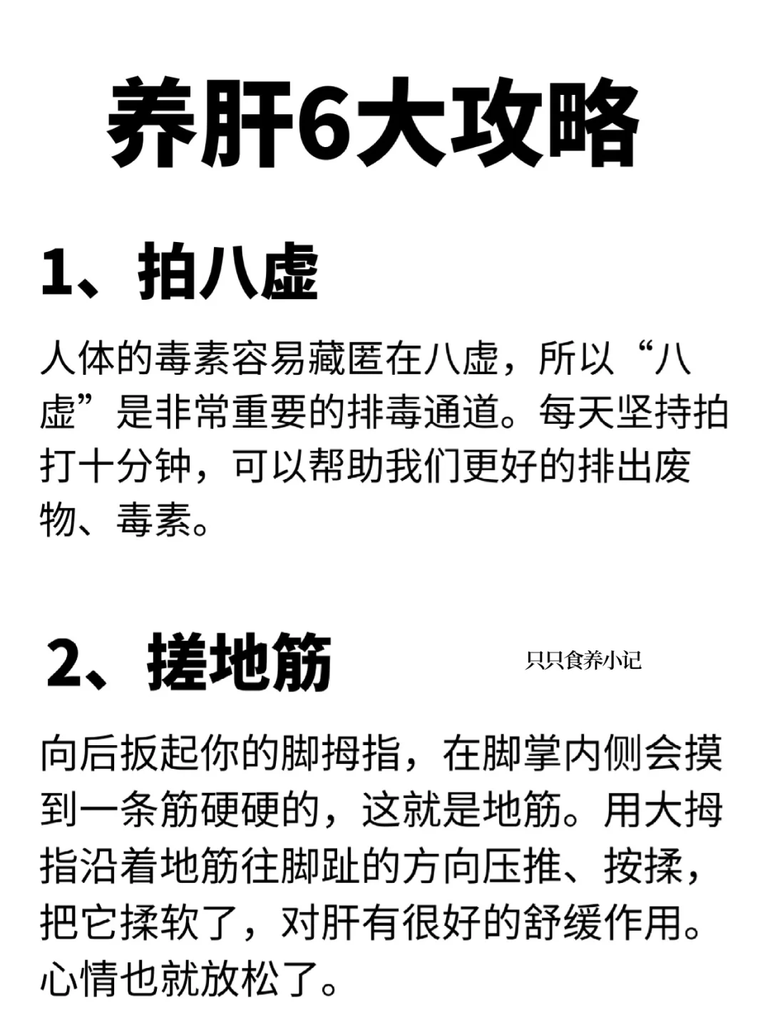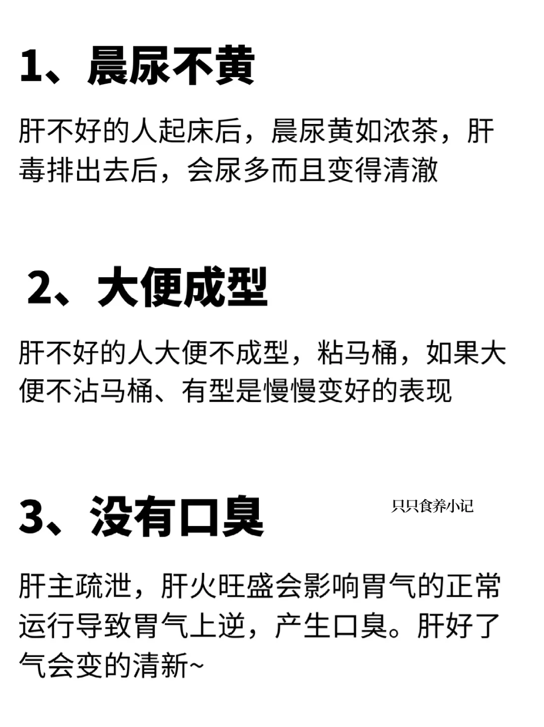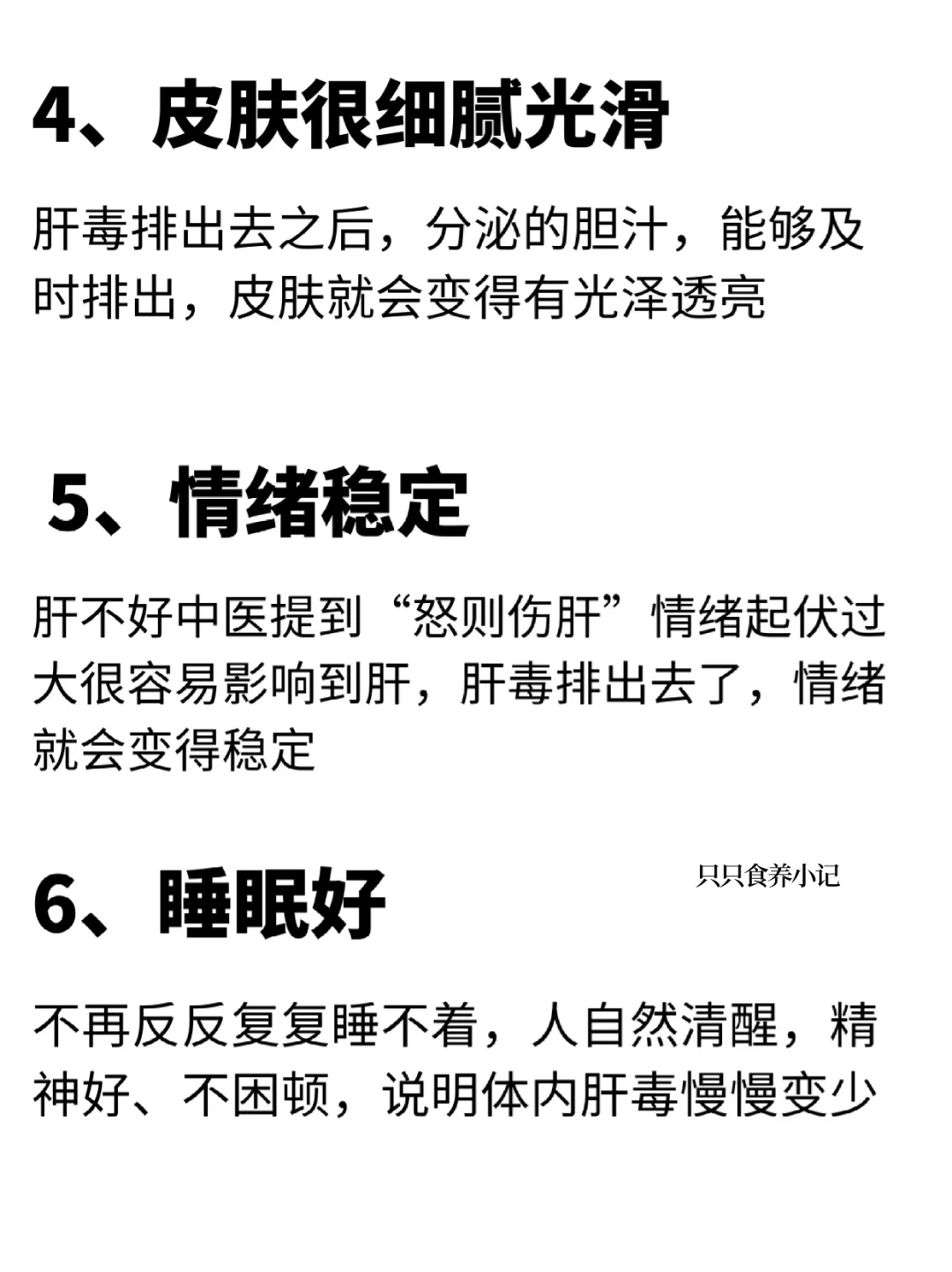 肝毒消失的6个表现 1️⃣晨尿不黄 2️⃣大便成形 3️⃣没有口臭 4️⃣皮肤很细腻光滑 5️⃣情绪稳定 6️⃣睡眠好 养肝5大攻略 1️⃣拍八虚 2️⃣搓地筋 3️⃣多吃青色 4️⃣狠狠睡觉 5️⃣睡觉前多泡脚