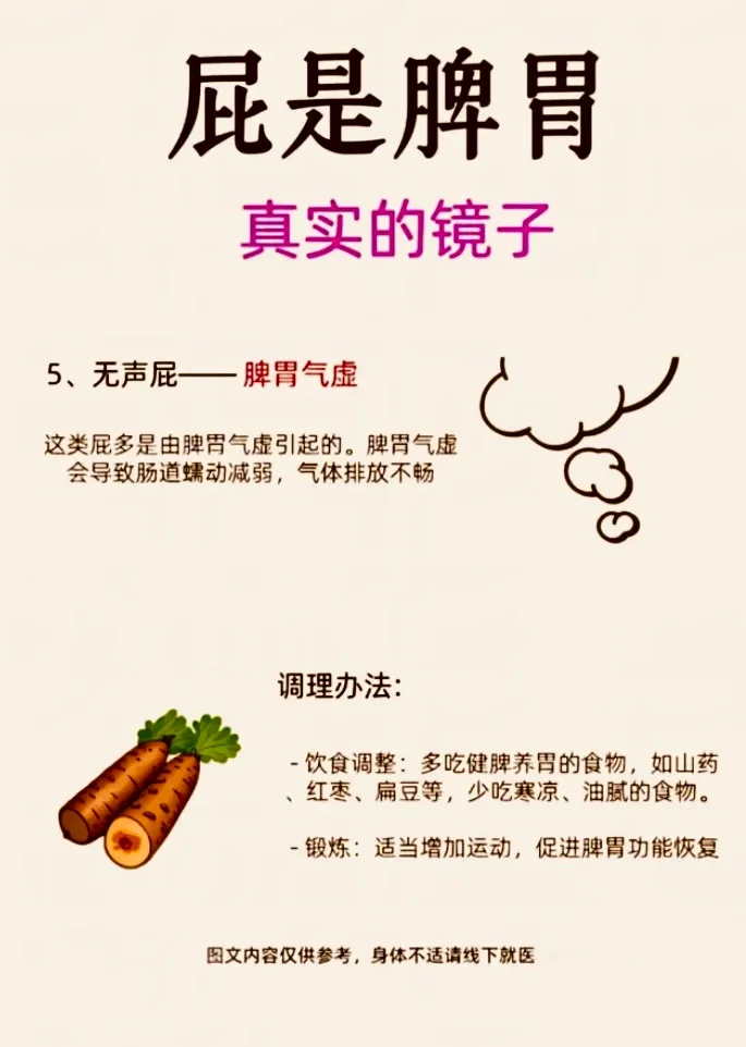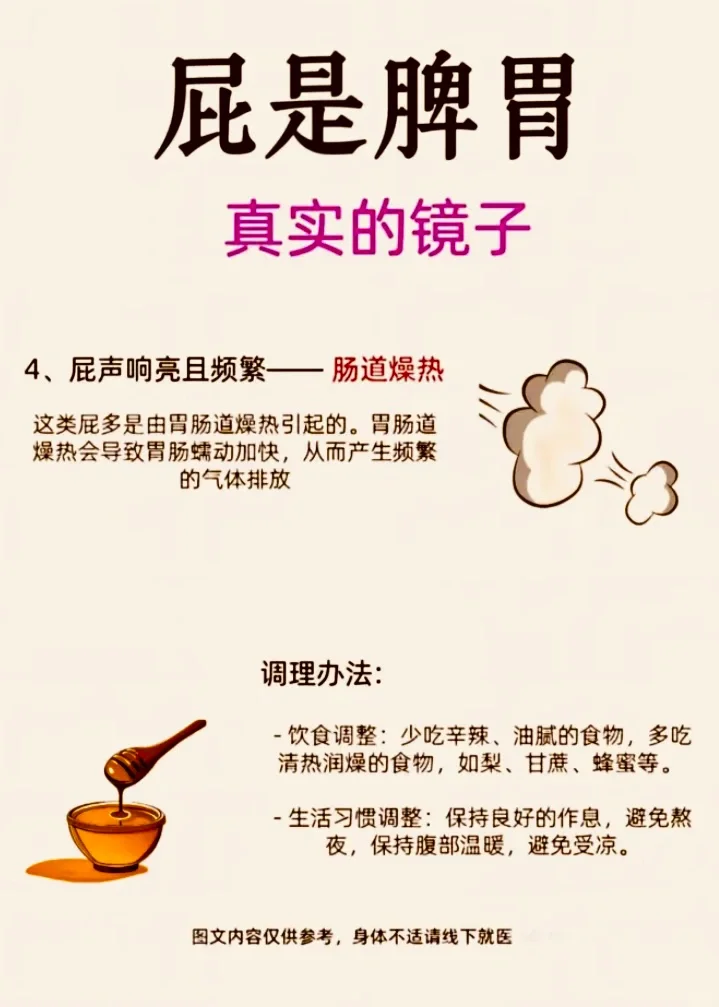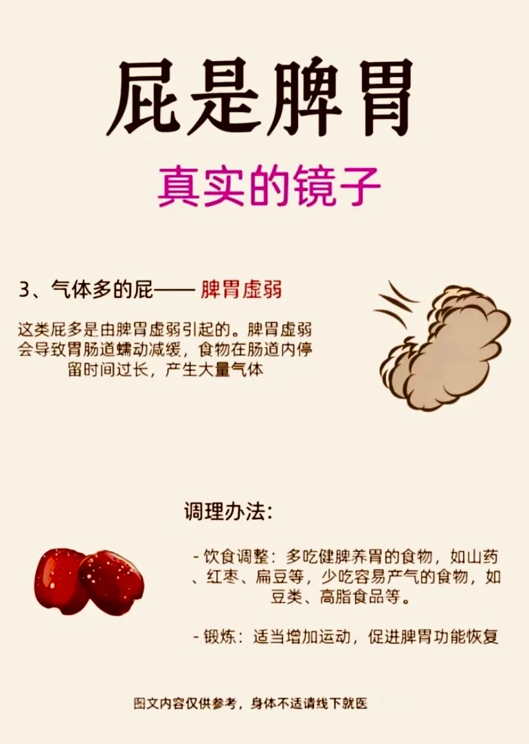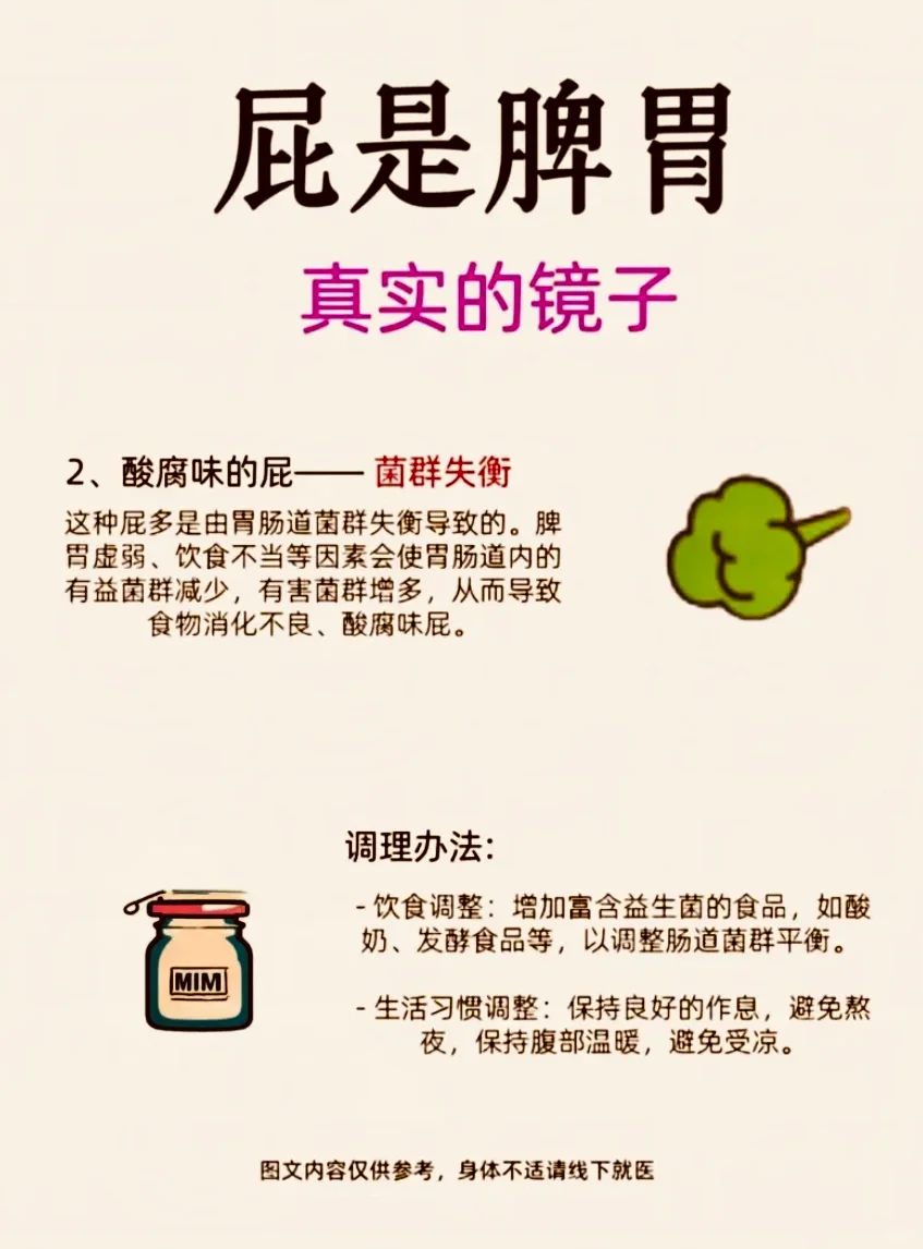 1、恶臭味的屁—脾胃湿热 2、酸腐味的屁—菌群失衡 3、气体多的屁—脾胃虚弱 4、屁声响亮且频繁—肠道燥热 5、无声屁—脾胃气虚