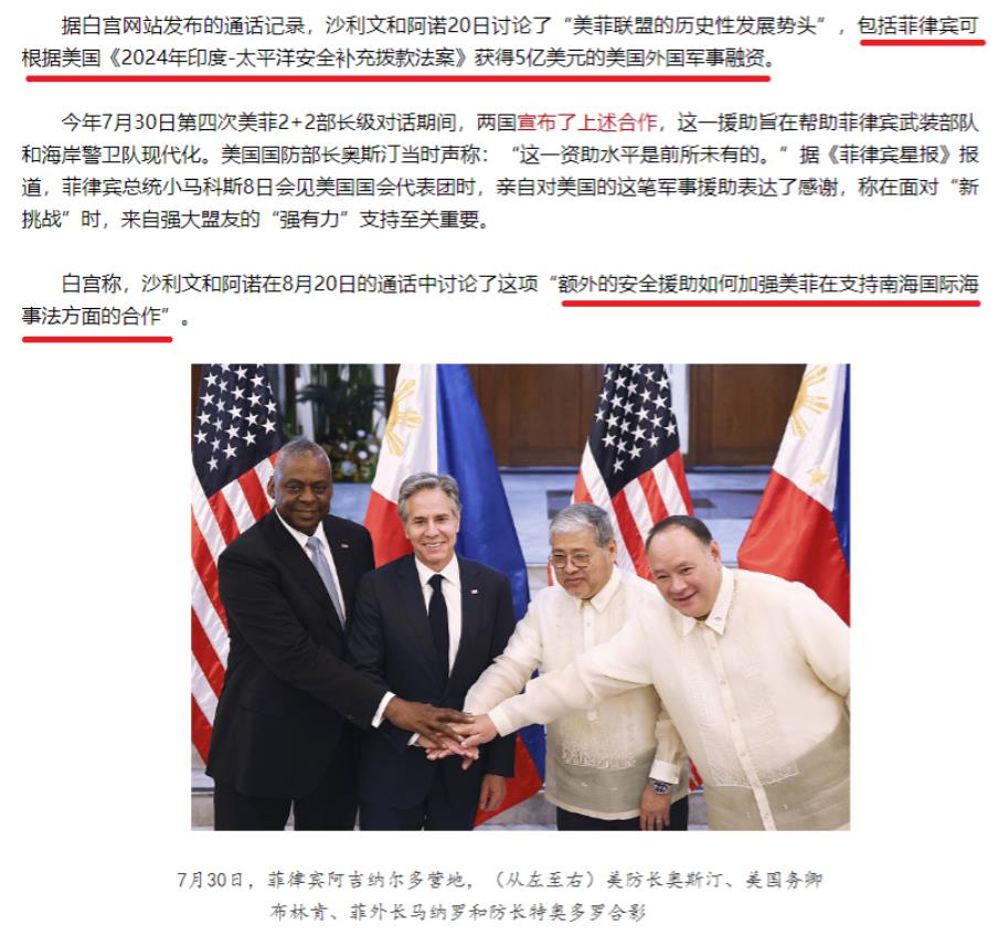 根据白宫网站20日发布的通话记录,总统国家安全顾问沙利文再次向菲律宾国家安全顾问阿诺确认了5亿美元援助承诺的有效性,但是也依然没有说定具体打款时间。不仅如此,沙利文还代表美方给菲律宾画了一个圈,要求美国提供的安全援助只能用在“南海事务”。所以美方也是同样不装了:你菲律宾拿了我的钱,就必须在南海继续搞事,想把援助花在其他地方是门都没有的。