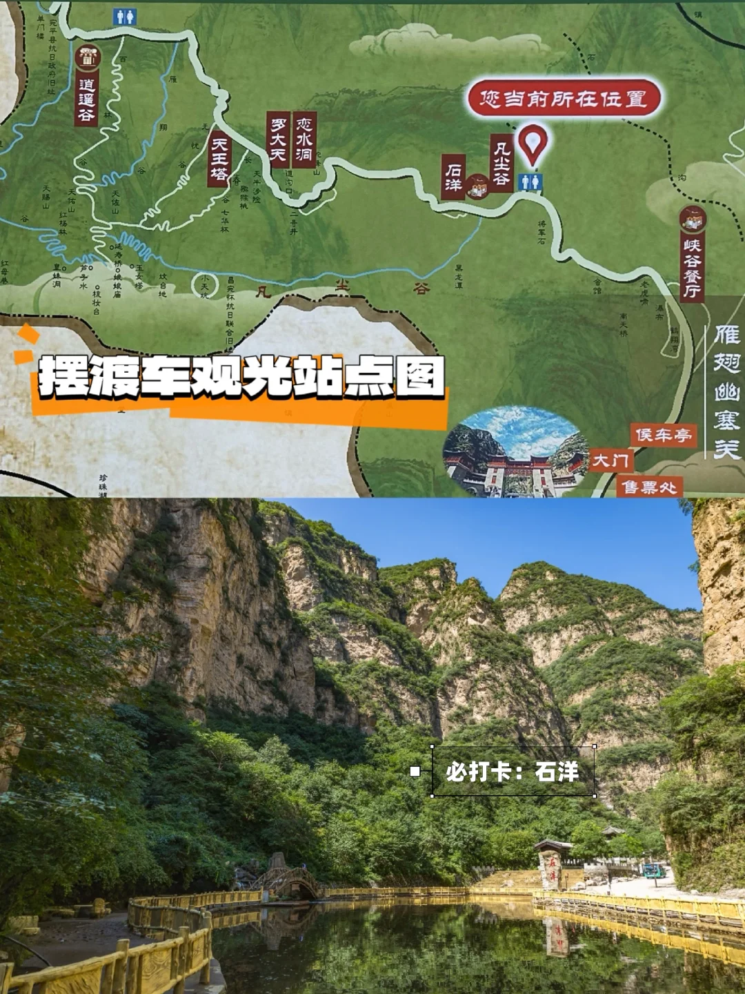 售票处(龙瀑)-峡谷餐厅(峡谷生活节市集、茶社)-凡尘谷(峡谷徒步、随石咖啡、石洋、飞拉达)-恋水洞-天王塔(来搭戏戏剧舞台)-逍遥谷(徒步明长城)