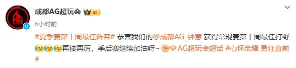 狼口拔牙,AG发文:恭喜我们钟意获得常规赛第十周最佳打野