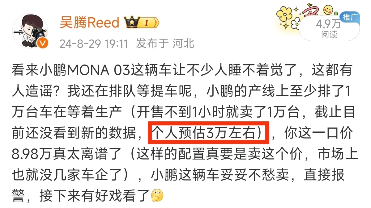 我昨天的预估还是挺准的,48个小时大定超过了30000台,够小鹏生产一个多月了,真不理解昨天造谣的8.98万的那伙人在想什么[允悲]