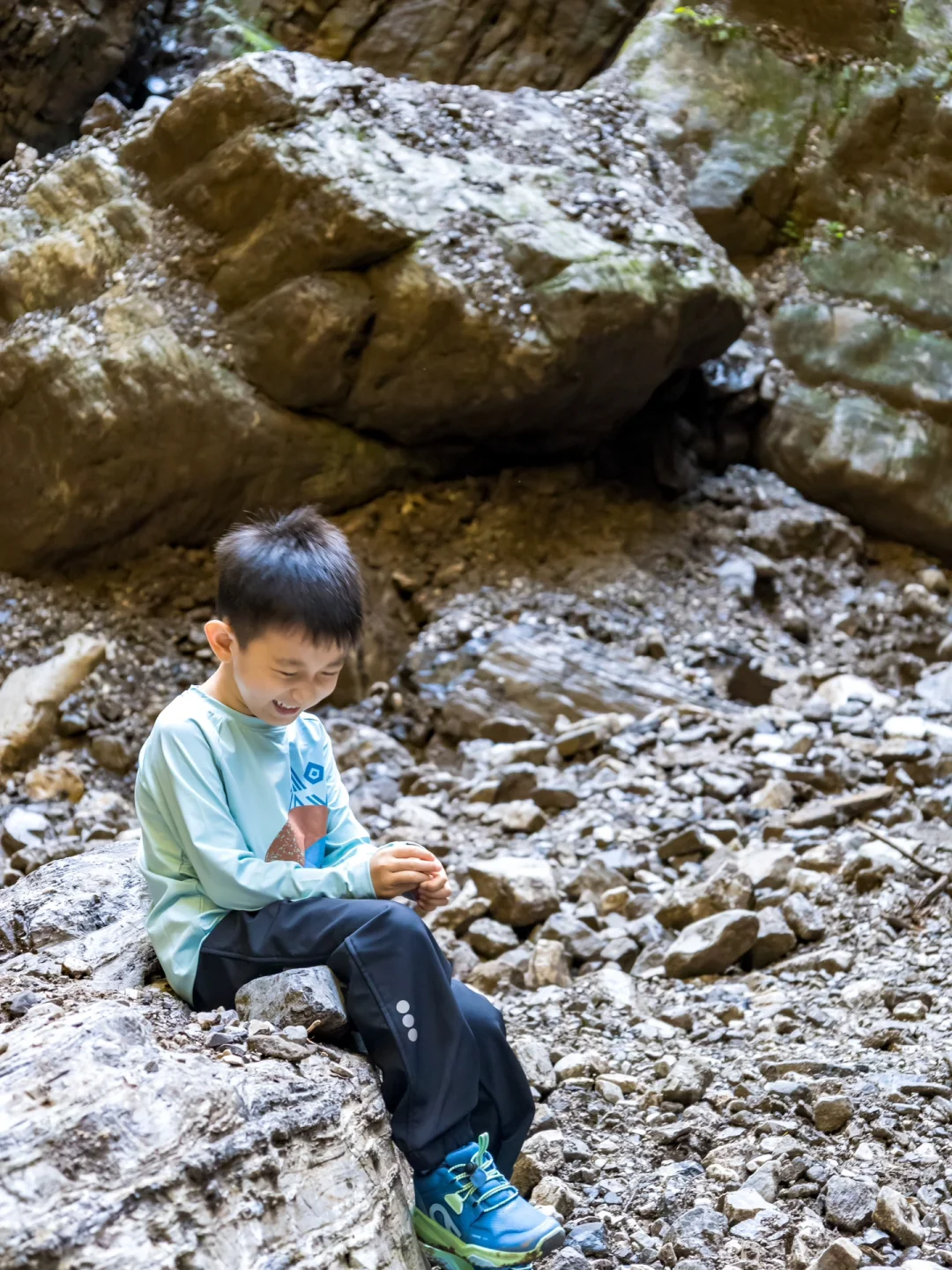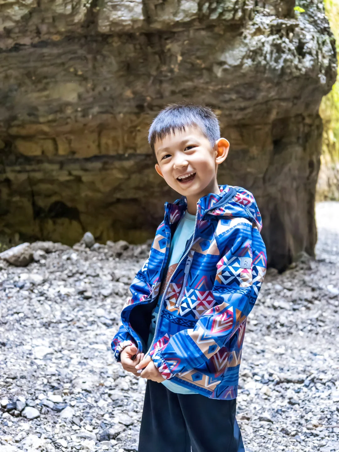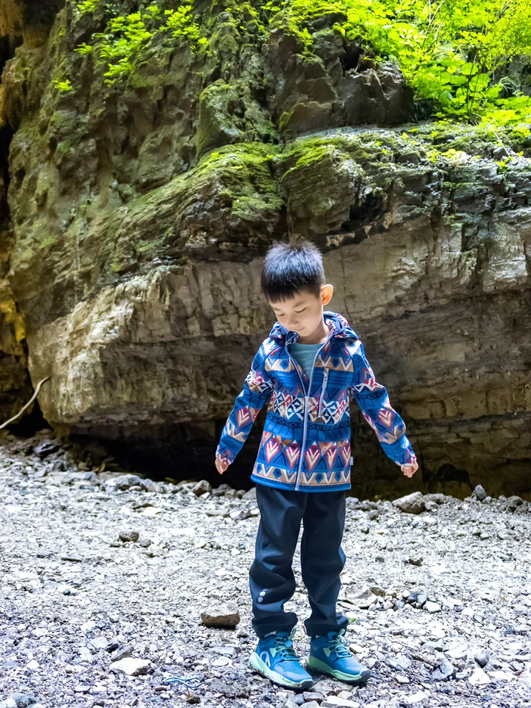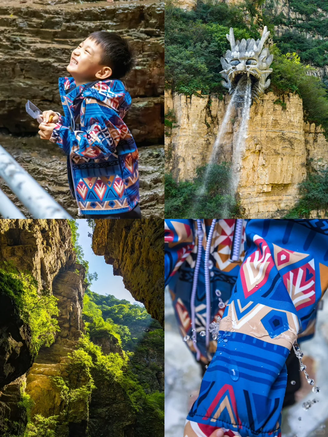 在滴水穿石的神奇山谷里徒步探险是非常新奇的体验~这次出行我选择了专业户外童装reima的冲锋衣、速干衣、户外裤、防水鞋四件套。不畏严寒、无惧风雨、自由享乐的slogan和我的育儿理念超级契合。防水防雨的设计超硬核,排汗速干功能也是超级赞,在防护的同时还能保障不闷热