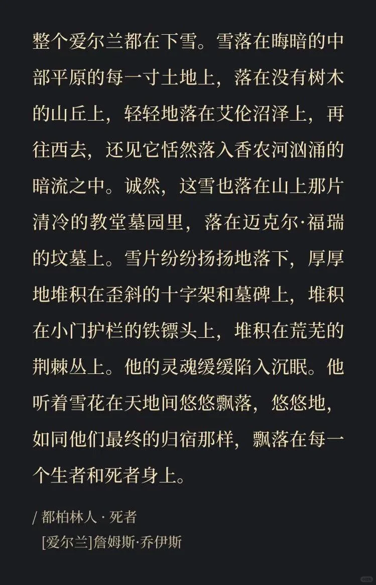乔伊斯在23岁写下《都柏林人》的大部分篇目,他写庸碌孤独的中年男人、写想要通过爱情逃离原生家庭的年轻女孩、写都柏林的淡漠、欲望、虛无与苦闷……他用笔如刀,偏又在难以料想的时刻展现出一丝不合时宜的温柔。小说结尾处,一场大雪覆盖整个爱尔兰,雪花落到平原上,落进沼泽里,飘落到所有生者和死者身上。格莉塔的心上人永远17岁,他的身影在花园尽头那棵树下若隐若现。雪花纷纷扬扬地落下,在这一刻我心中的氛围感之神忽然有了形貌。