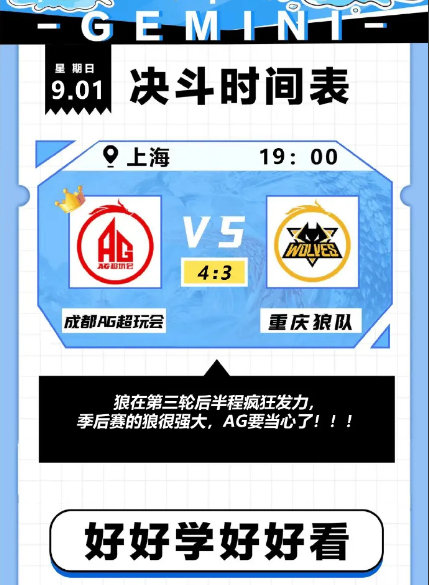 战至巅峰对决,Gemini预测今日赛果:成都AG 4-3 重庆狼队!