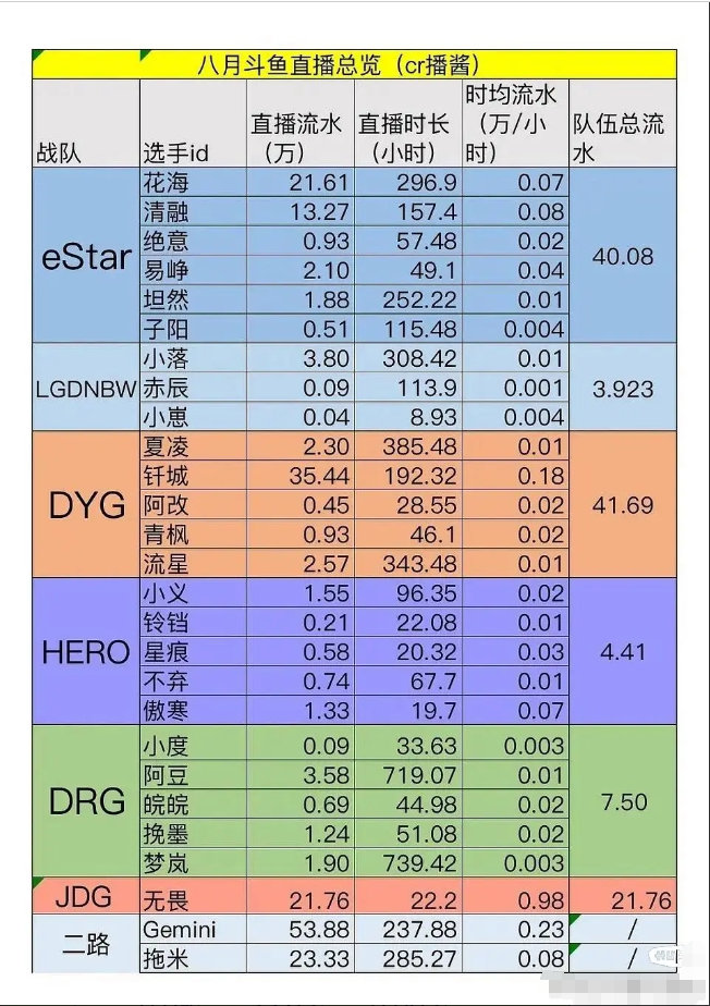 职业选手八月直播流水排名:钎城、无畏、花海前三