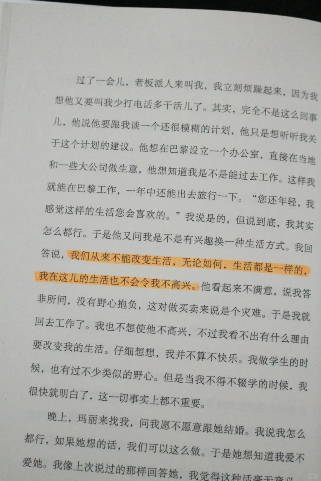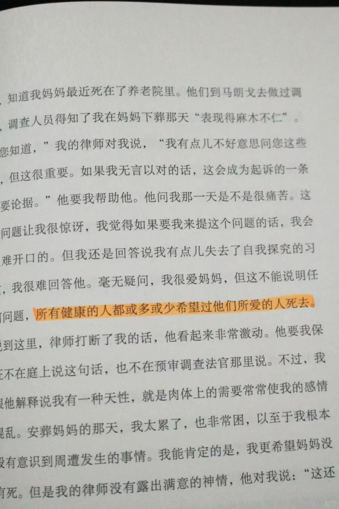 看完《局外人》,好喜欢默尔索的精神状态啊!对生活始终保持旁观者心态,对一切都无所谓,母亲的去世,他觉得人都要死的,所以没有哭,女友提出结婚,他觉得结不结都可以,上司提出升职去巴黎,他觉得去不去都可以。