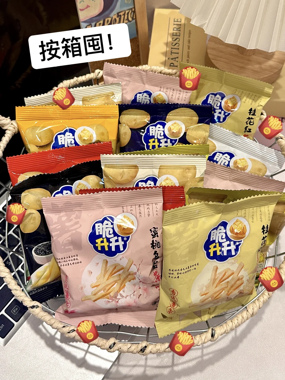 薯条我真的只认脆升升家的!巨好吃! 小袋薯条已经发展到11种口味了! 开学带回宿舍不到三分钟…秒空😅 原切实心的薯条又香又脆!土豆味好浓郁! 每根薯条上面都裹满了粉粉! 好吃到嗦手指!谁懂啊! 新出的桂花红茶味🌼和蜜桃乌龙味🍑 茶香和花香完美地融合在一起 吃了一口满满恋爱的感觉!嘴巴都香香的! 自己加点辣条、干脆面啥的拌着吃更上头! 都是独立小包装好适合带出门解馋! 没忍住又囤了几箱中秋聚会和亲戚们分着吃!