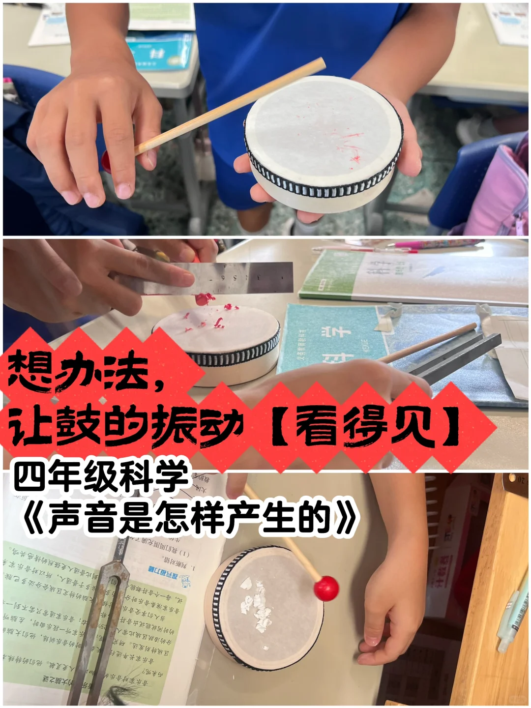 在【让小鼓的振动看得见】的实验后,学生就自己能解释那些问题了。