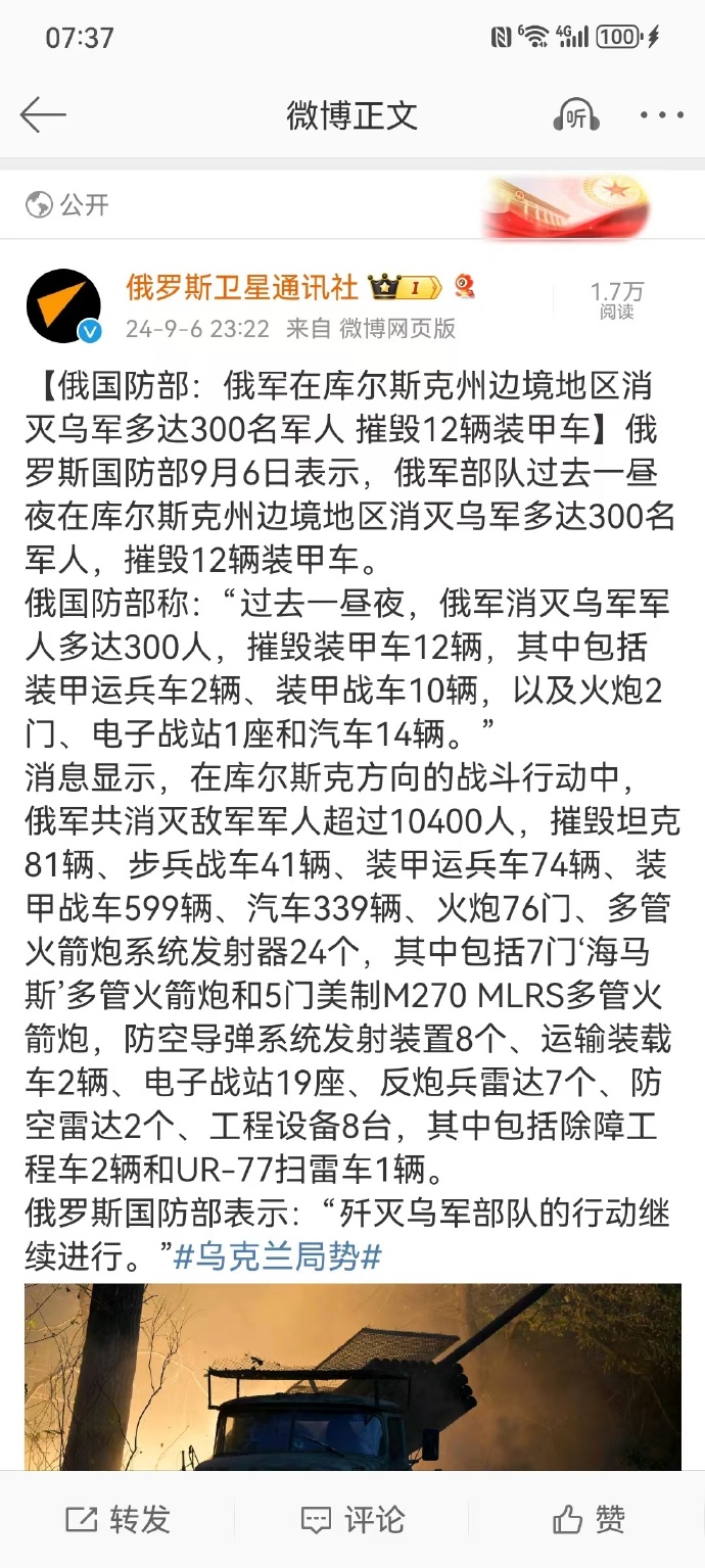 #俄罗斯战报#【俄国防部:俄军在库尔斯克州边境地区消灭乌军多达280名军人】俄罗斯国防部9月7日表示,俄军部队过去一昼夜在库尔斯克州边境地区消灭乌军多达280名军人,摧毁3辆坦克和1门M777榴弹炮。消息显示,在库尔斯克方向的战斗行动中,俄军共消灭敌军军人超过10700人,摧毁坦克84辆。