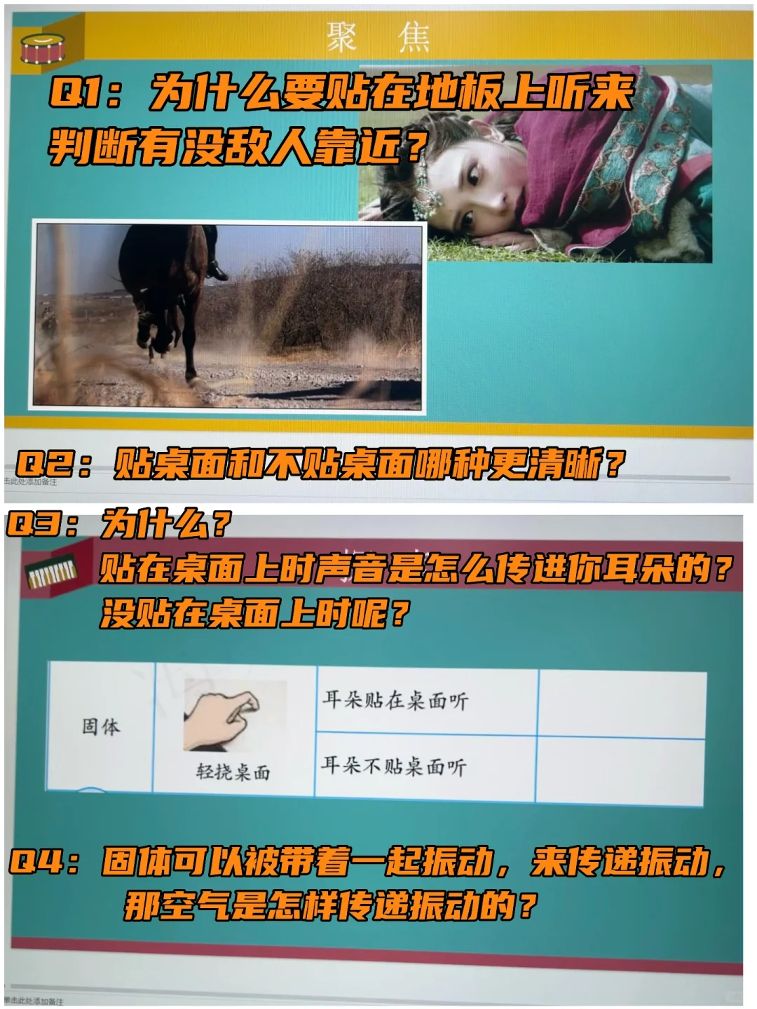 🔵贴在桌面时:声音振动【带着固体】一起振动,直接传到耳朵