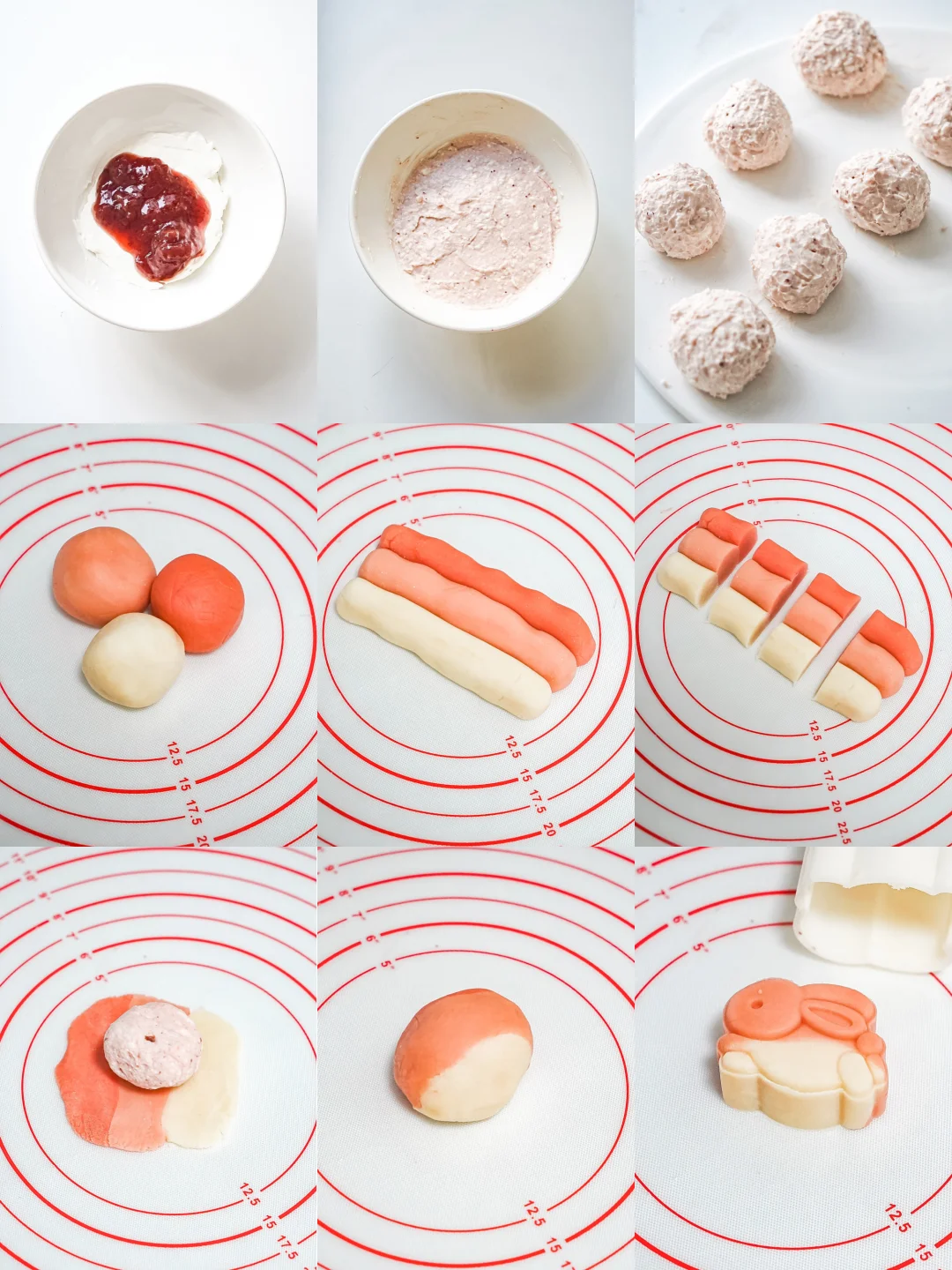 ▪️将草莓奶酪内陷包入草莓渐变饼皮,用虎口收紧,取兔兔月饼模具按压成型。