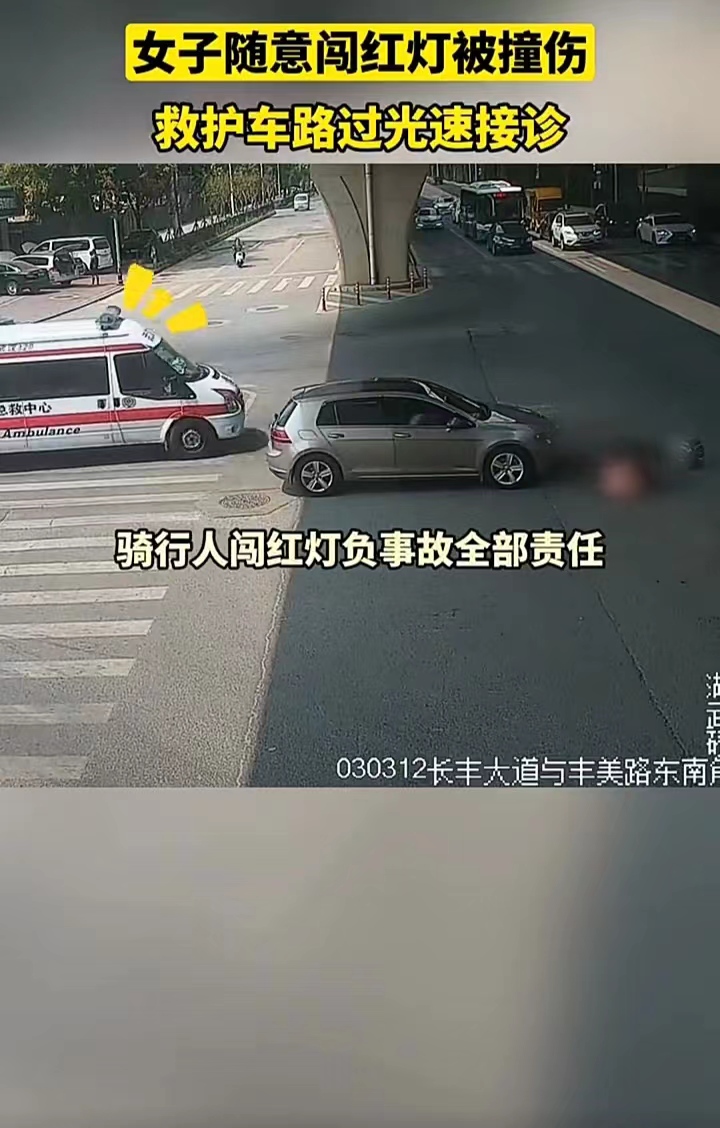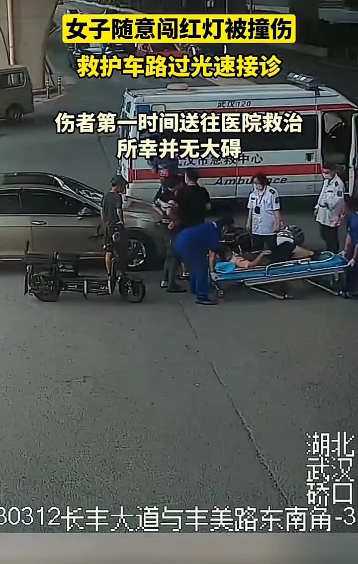 近日,湖北武汉一名女子骑电动车时随意闯红灯,导致被迎面而来的小车撞倒。幸运的是,小车后面跟着的是一辆救护车,医护人员下车后,连忙将女子送到医院救治。所幸并无大碍,但这次事故女子需负全责。