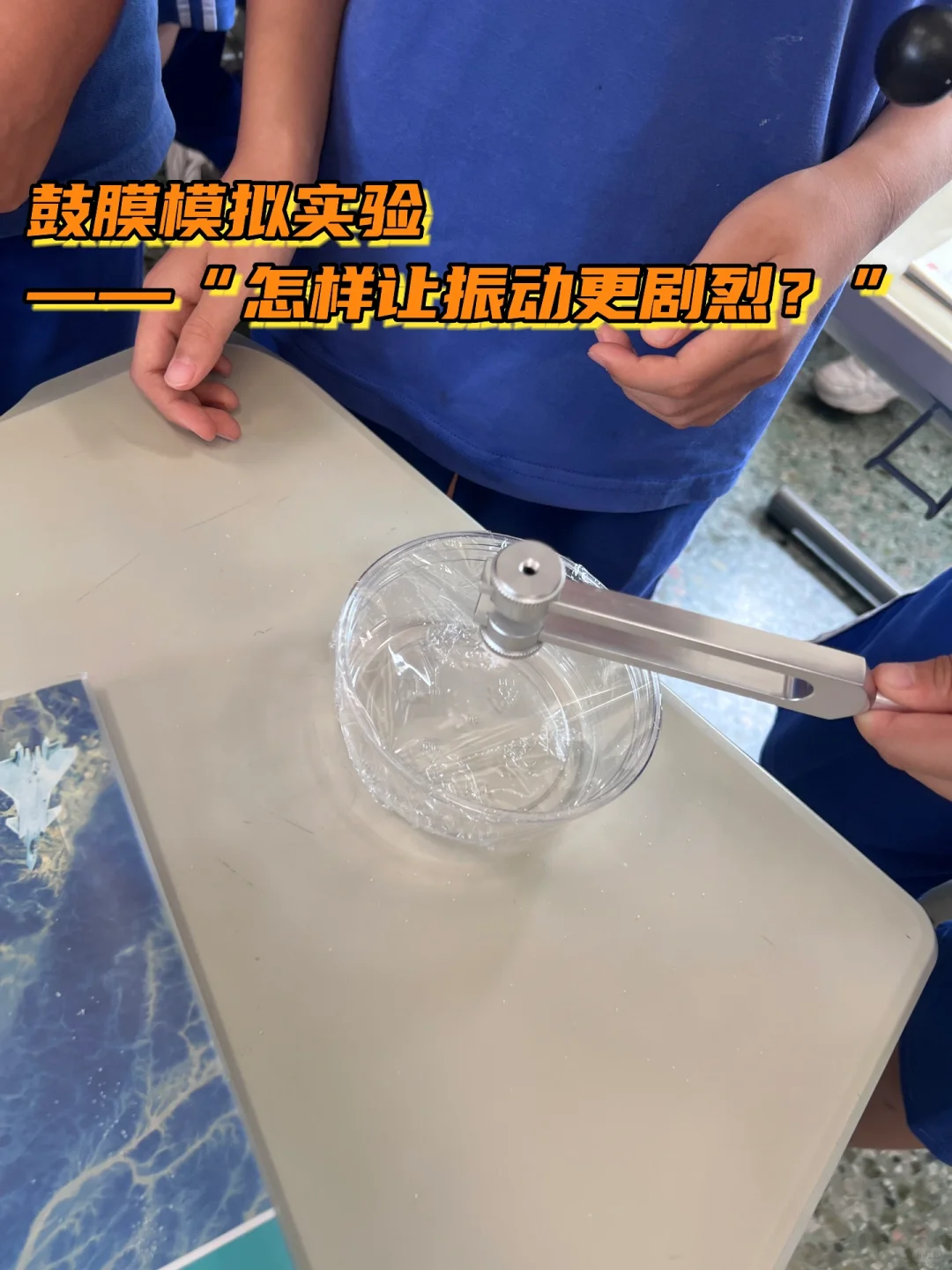 提醒学生【模拟实验要符合现实】,现实的音响不会贴着耳膜发声,因此音叉也不能碰到保鲜膜!