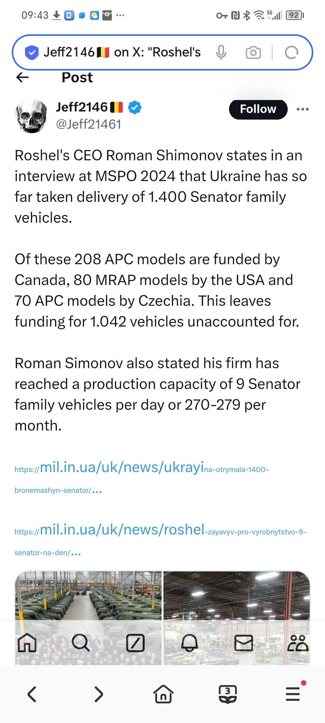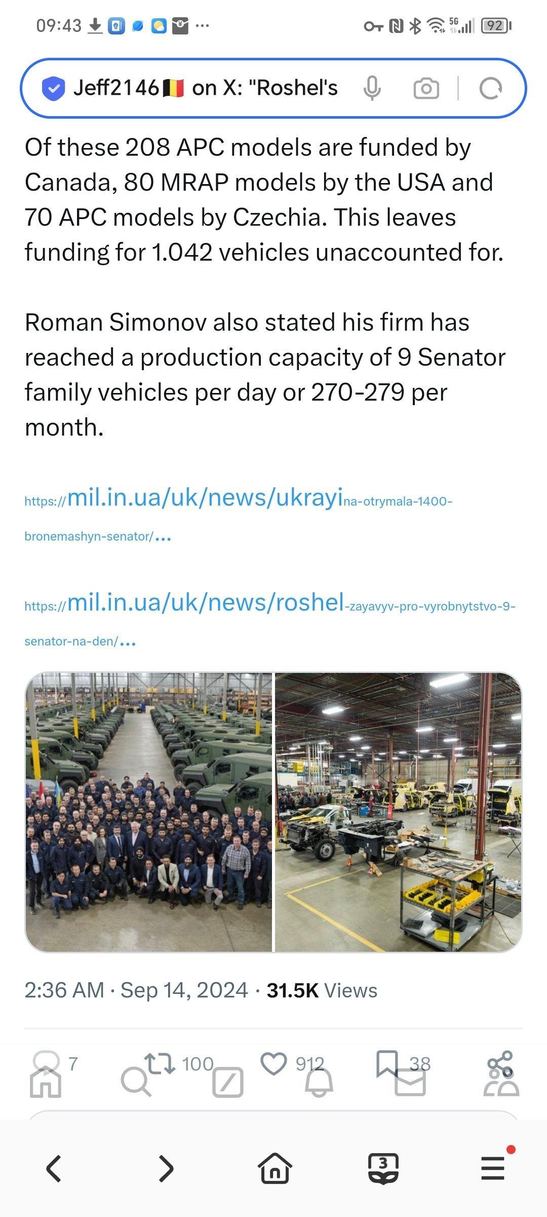 罗谢尔公司首席执行官罗曼-西蒙诺夫(Roman Shimonov)在 MSPO 2024 上接受采访时表示,乌克兰迄今已接收了 1400 辆 "参议员 "系列车辆。
