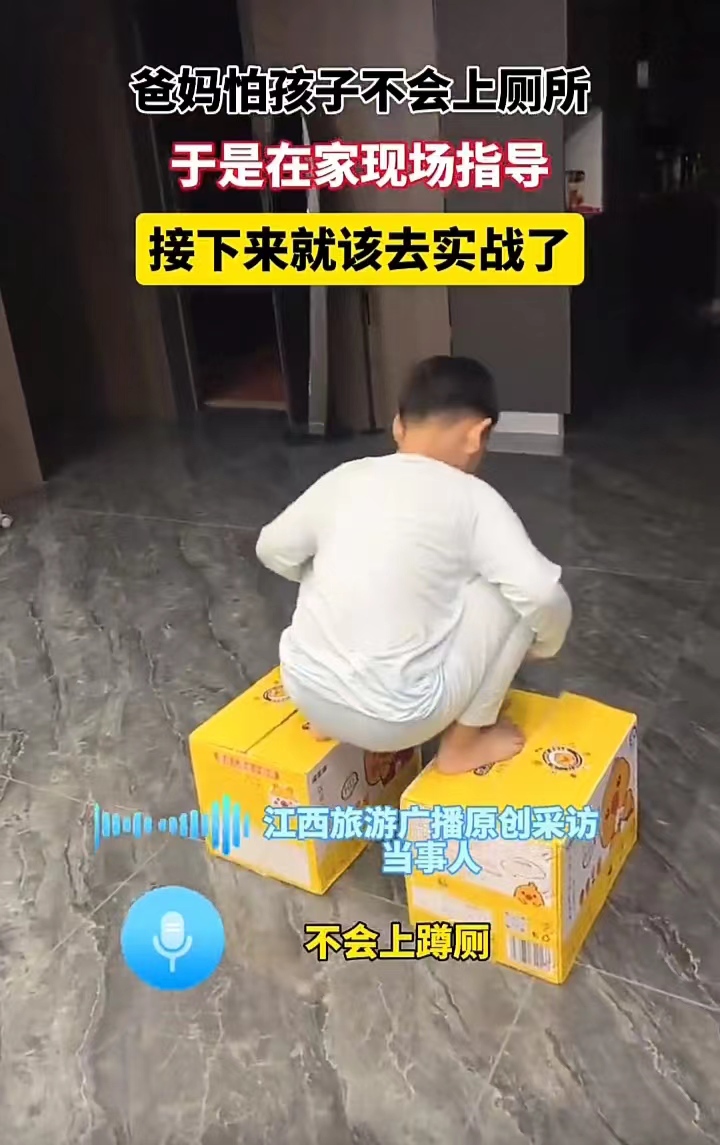 9月13日,黑龙江一户家庭内,因为孩子从幼儿园升到了小学,学校的厕所也从坐便变成了蹲便,已经出现其他孩子因为不会用厕所导致尿裤子,为了防止自己的孩子出现这种情况,爸妈便提前给孩子特训,用两个纸箱教孩子如何蹲便。
