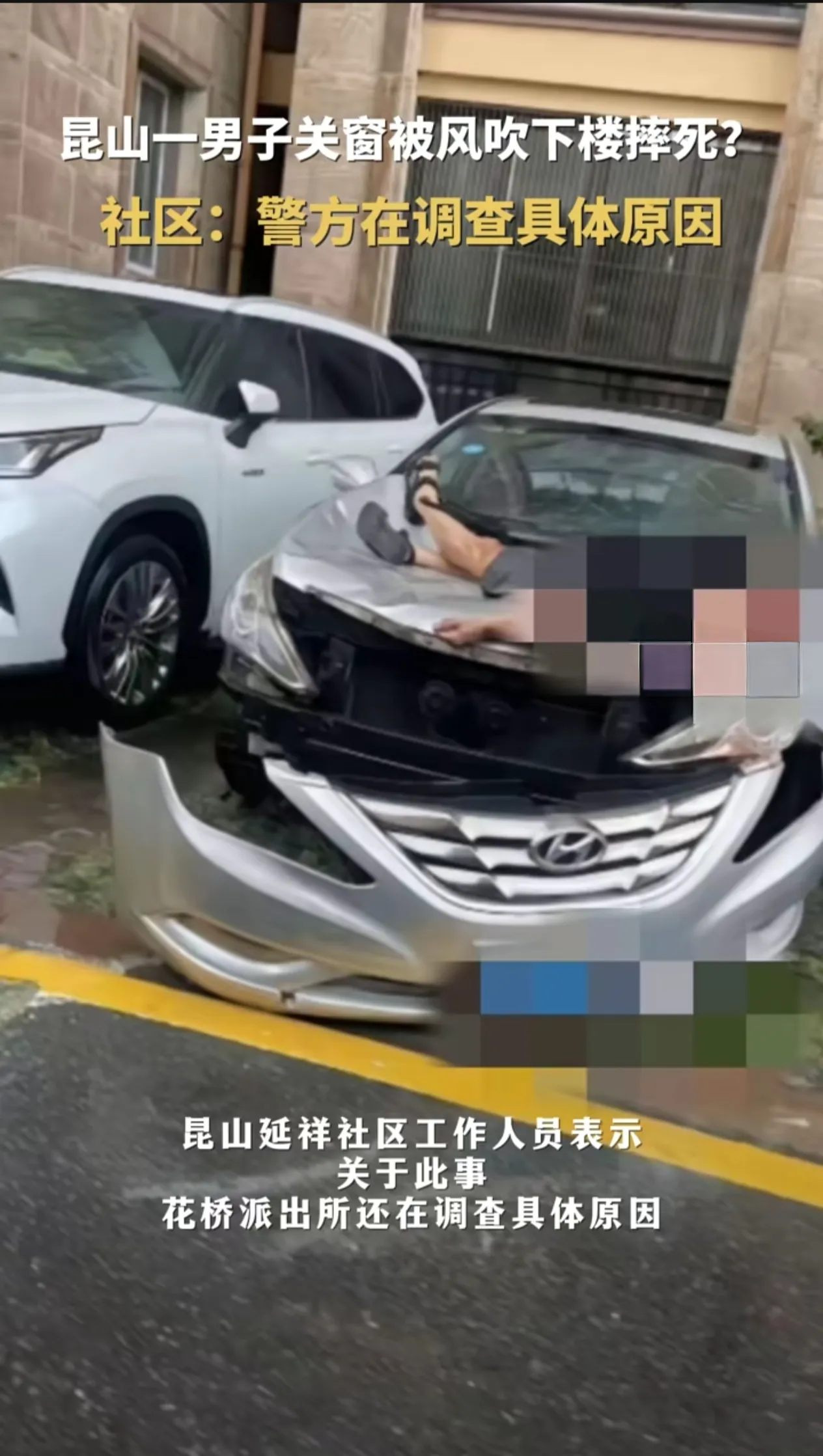 男子把半边身子探出窗外,准备用力拉窗户关闭时,正巧来了一阵超强的大风,直接将男子吹下楼,导致男子掉落到,楼下一辆轿车引擎盖上,当场身亡,强大的下坠力,轿车的前保险杠,已经裂开弹出,事故发生后男子已被专业车辆拉走,事发周围也被拉上警戒线,昆山延祥社区工作人员表示,关于此事纯属谣言,花桥派出所已经介入调查造谣者。