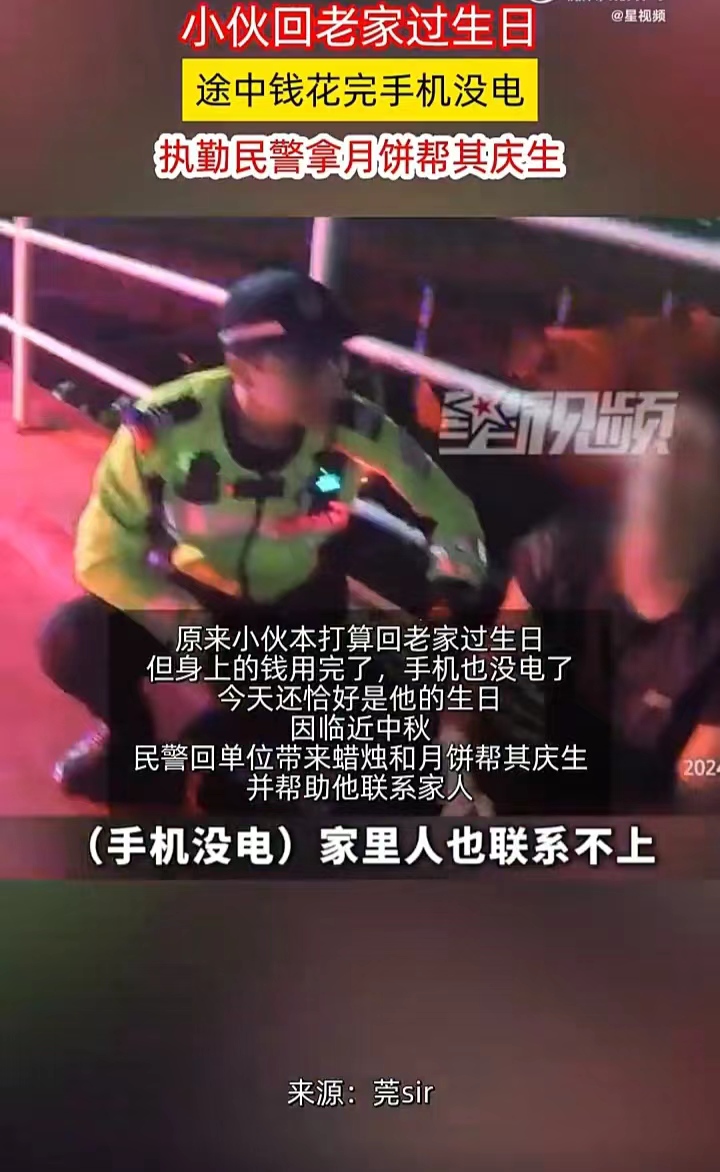 近日,广东东莞一位民警在巡逻时,看到一名小伙独自坐在路边,于是上前询问情况,得知小伙原本打算回老家过生日,但身上的钱都用完了,手机也没电了。民警见状让他等自己一会,回到单位拿来月饼和蜡烛,帮助小伙庆生,同时也联系到他的家人。