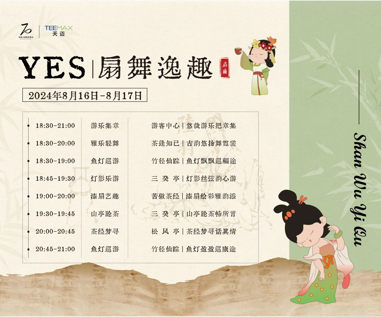 民乐舞蹈|鱼灯巡游|非遗漆扇🎏🎏 游乐集章|雅乐轻舞|灯影乐游🪅🪅 山亭论茶|茶经寻梦|竹径仙踪🍃🍃 📸打卡沉浸式体验 𝑵种玩法✨ ⏰8月每周五周六18:00-22:00 🚗湖州市吴兴区妙西镇杼山文化园