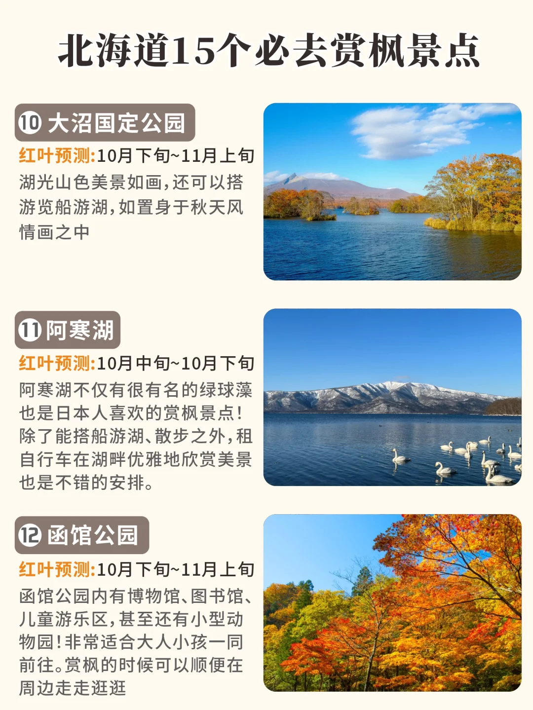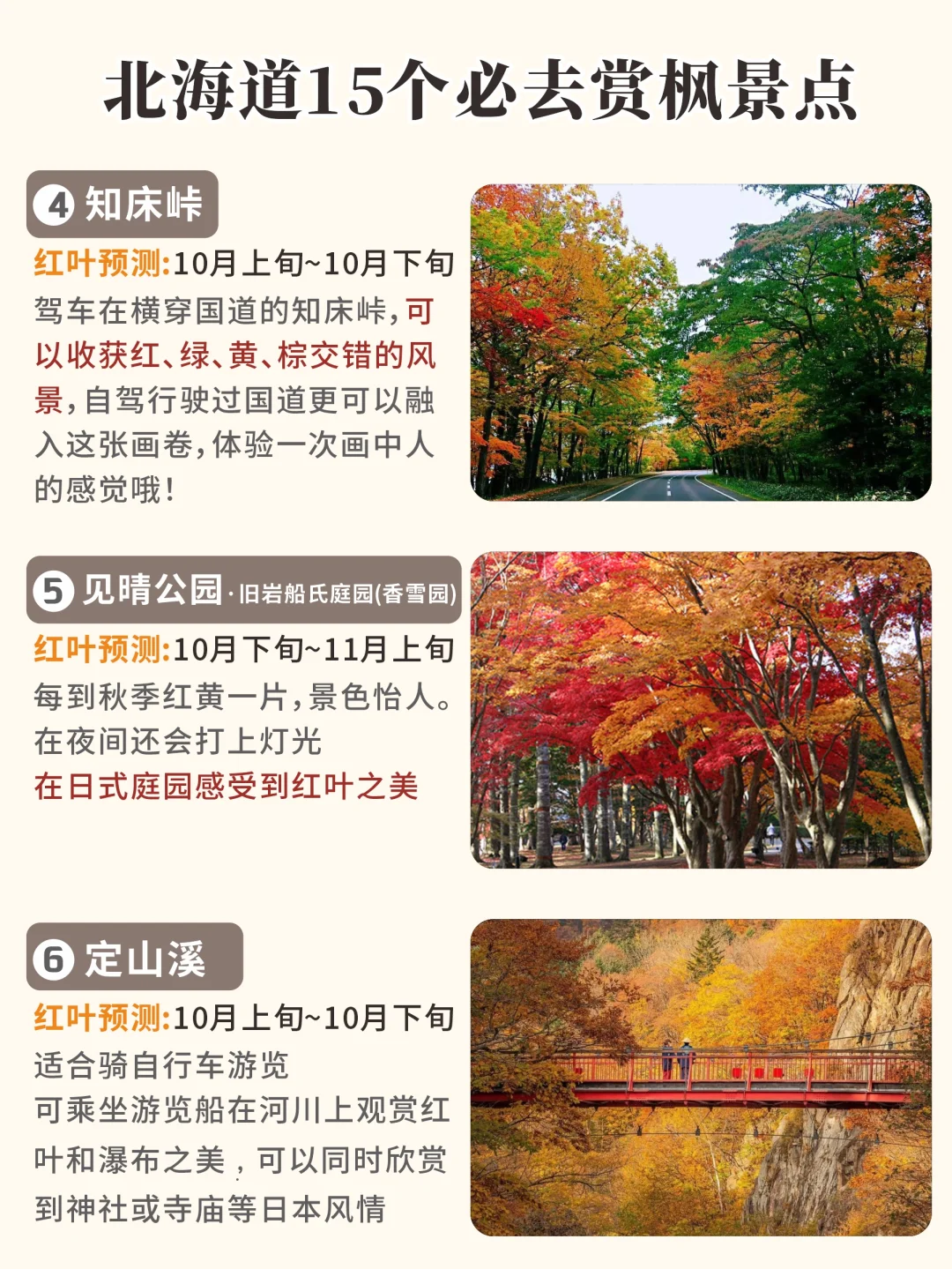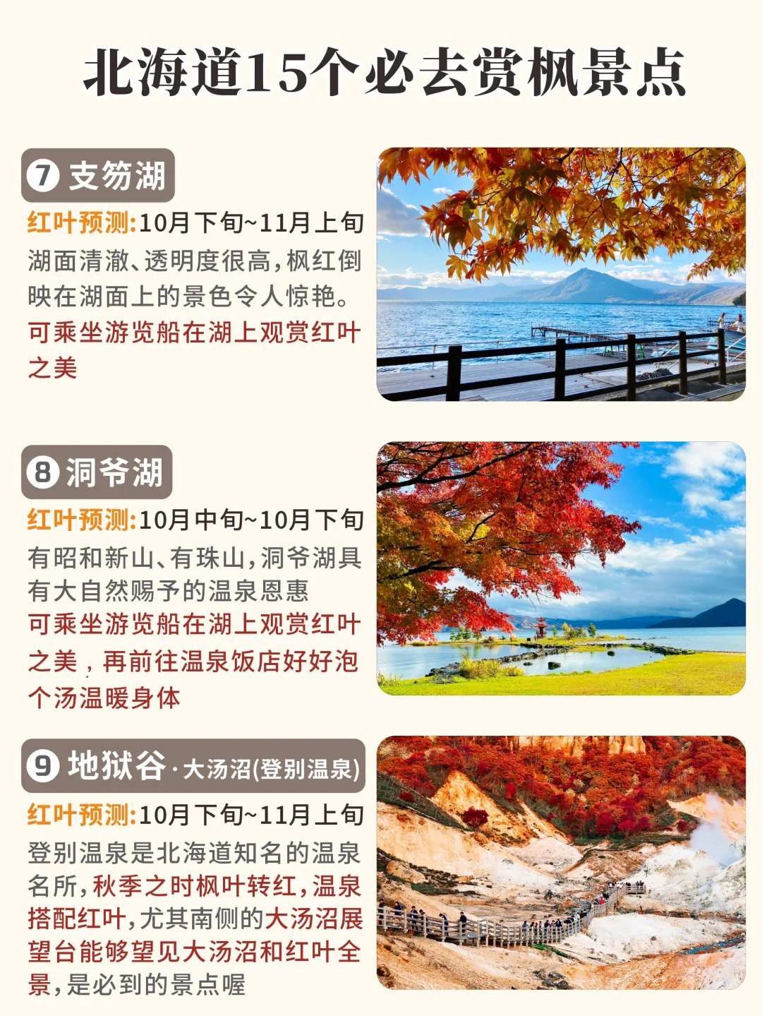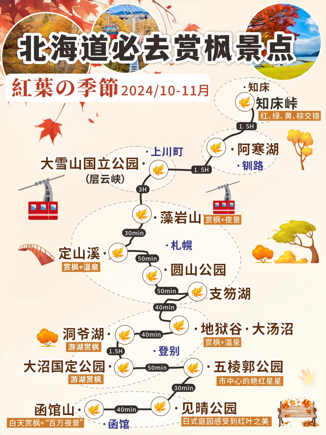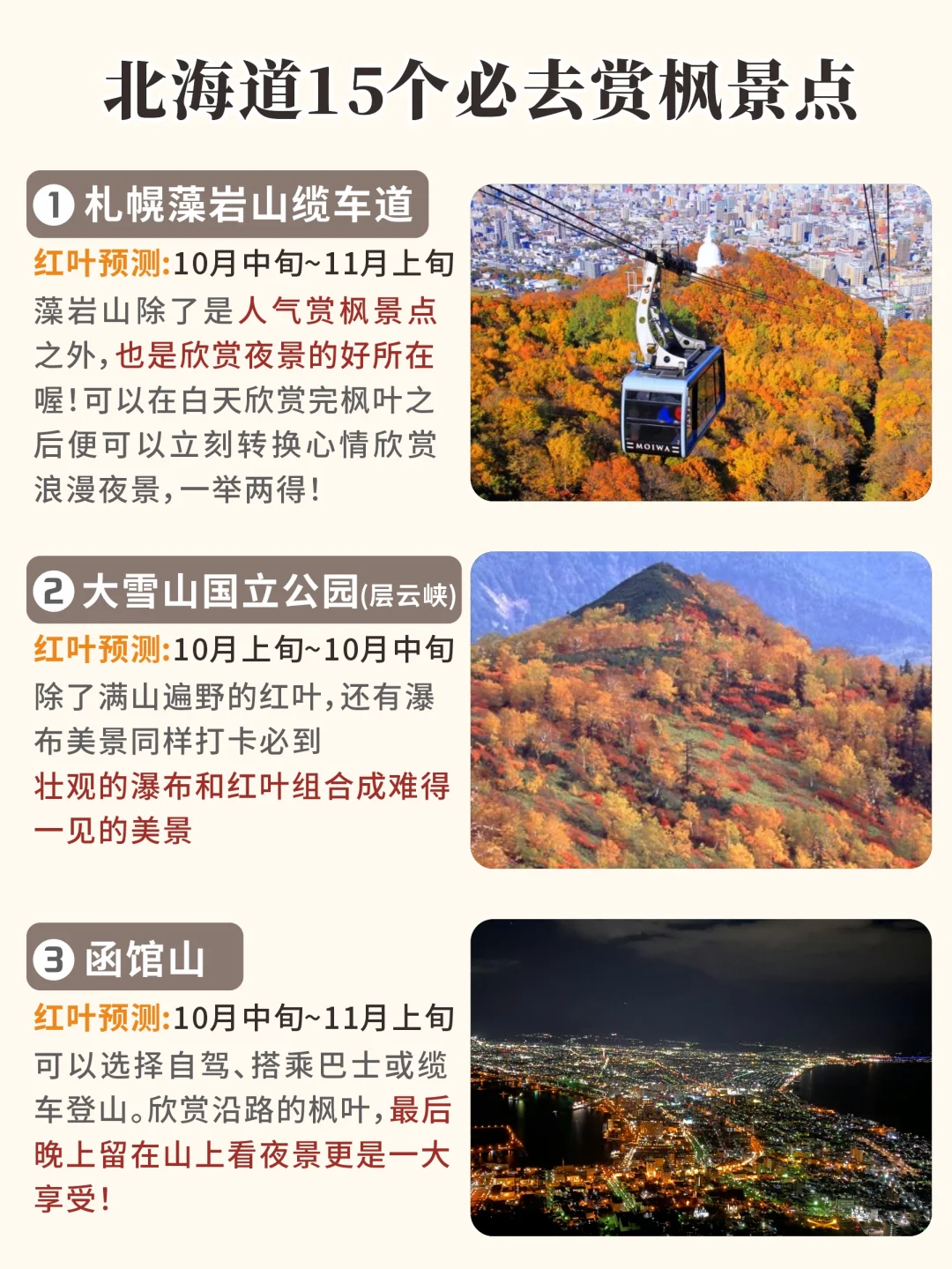 日本zui早的秋色是从北海道开始的,十🈷️就可以体验日本的秋色🍁,红叶从大雪国立公园的高峰慢慢下行,在秋季的北海道,无论何地都能遇见美丽的红枫,札幌、富良野😀周边、川汤……很多一等一的赏枫景点,小编特意整理了北海道赏枫🍁景点介绍(图2-6)大家可以收藏起来